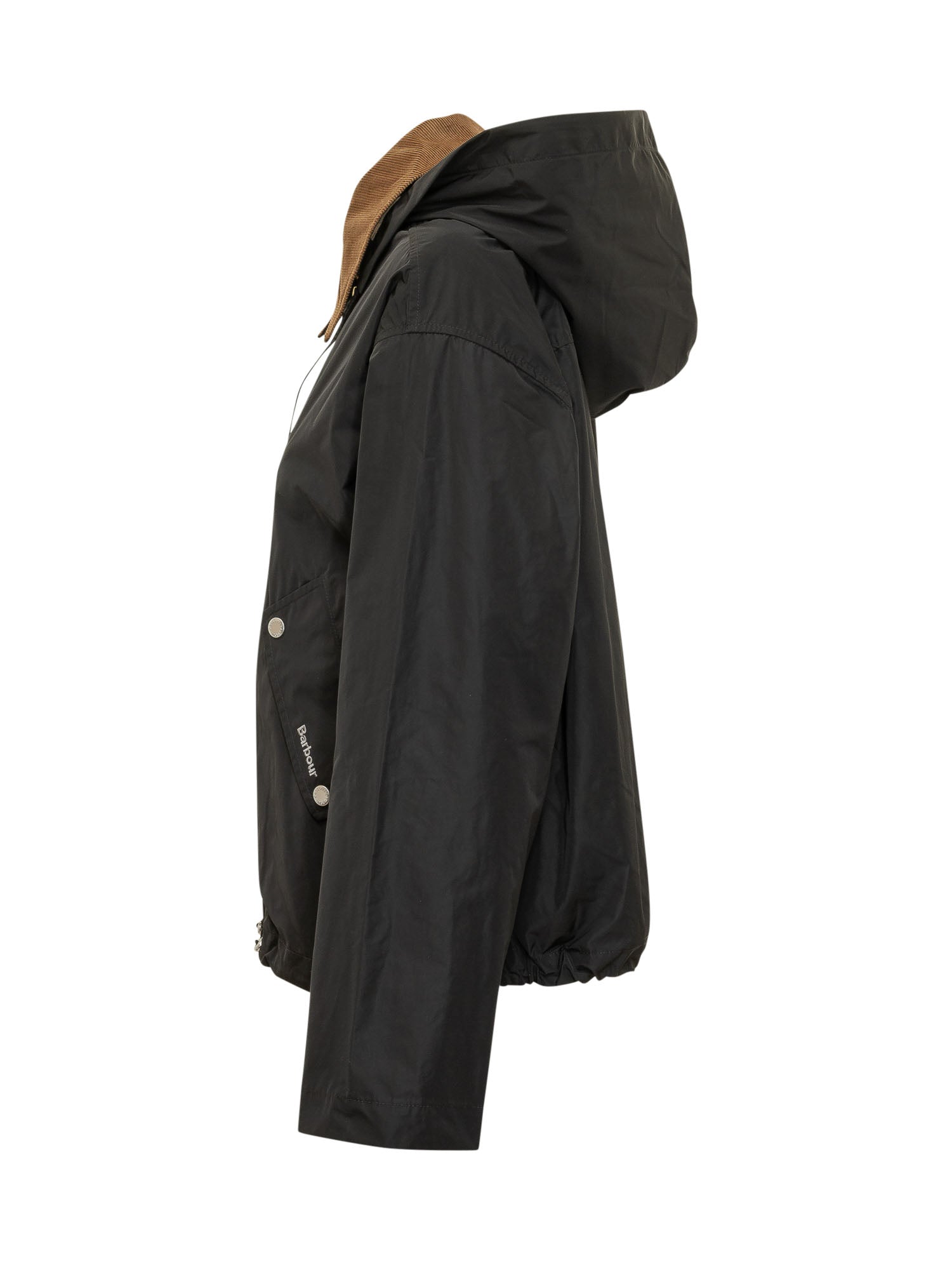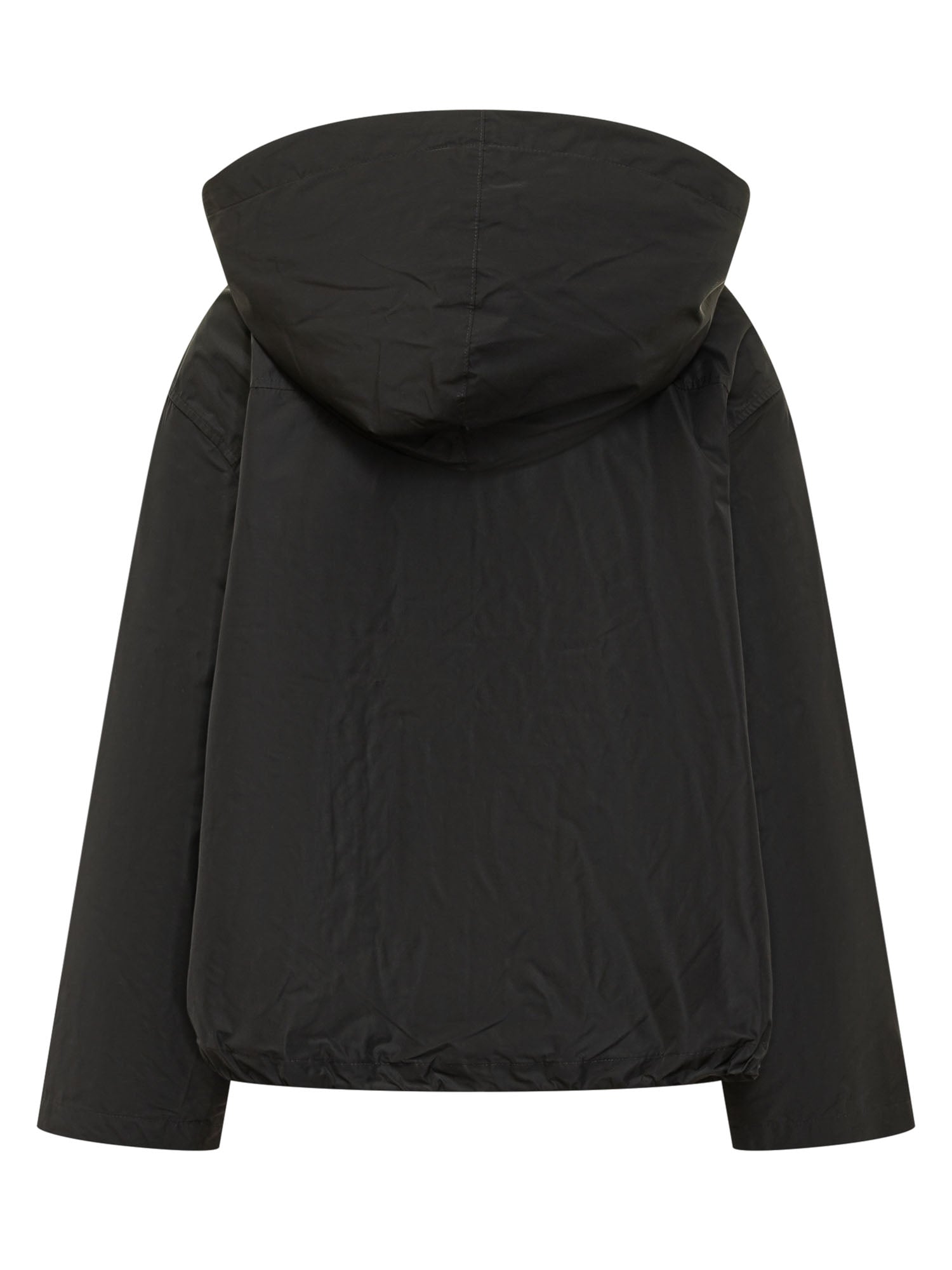 Giacca con cappuccio e colletto a contrasto, chiusura frontale con zip, tasche con patta e bottone, fondo regolabile con coulisse, design funzionale e lineare