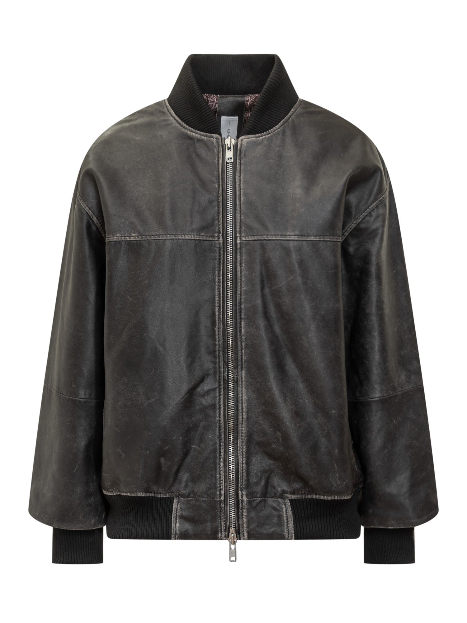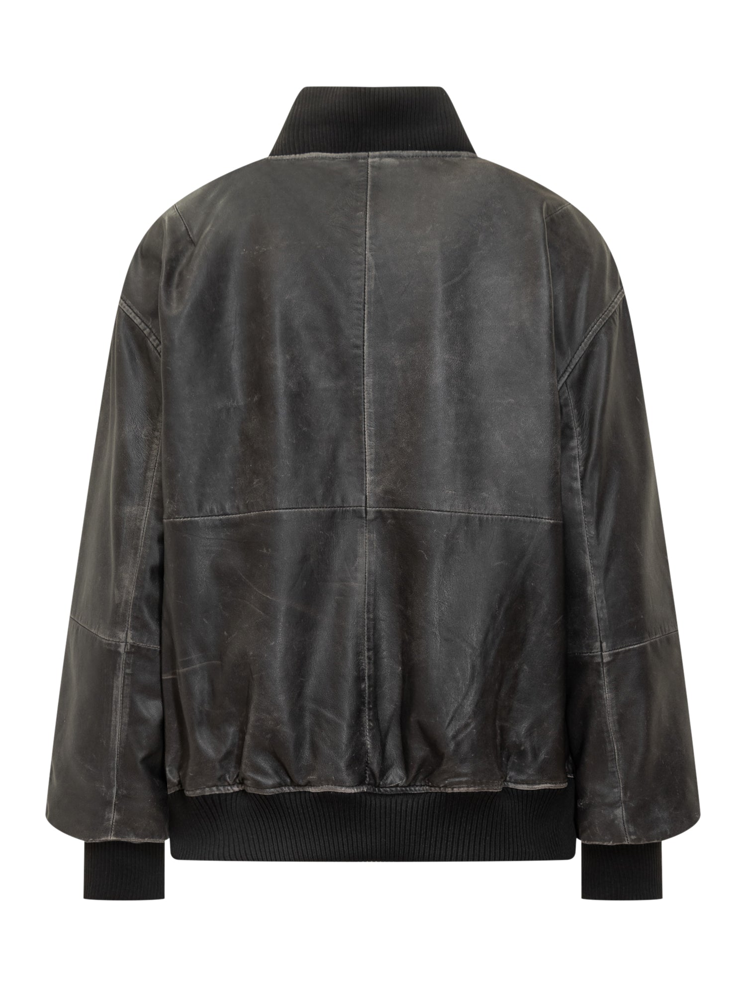 Giacca bomber Bully in pelle nera effetto vintage con zip frontale e dettagli a coste.