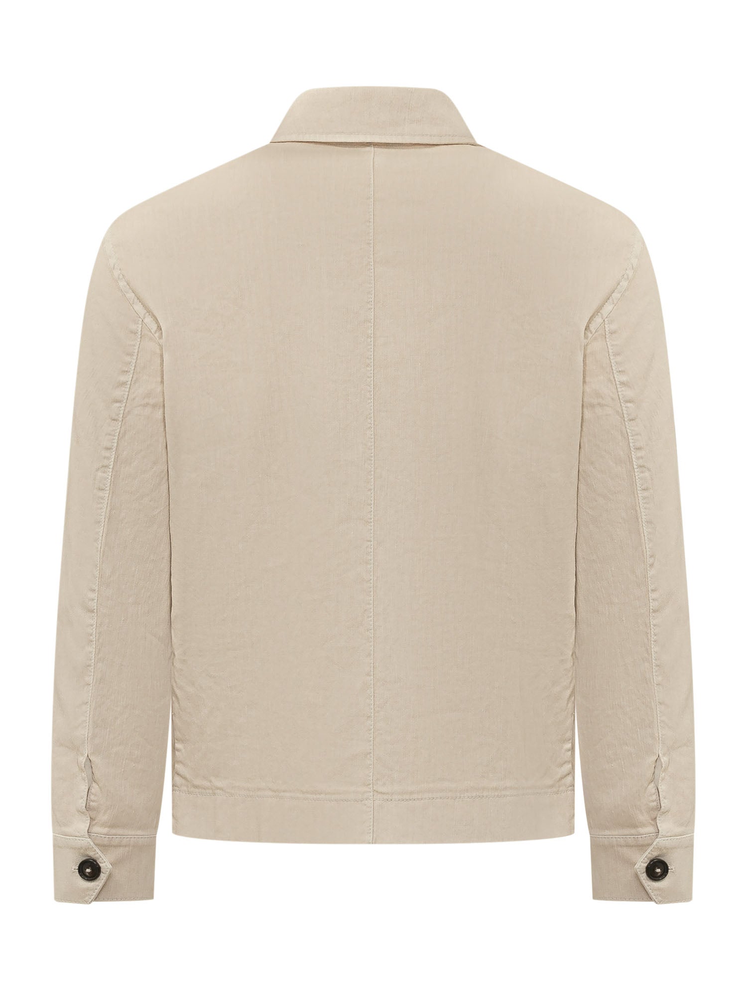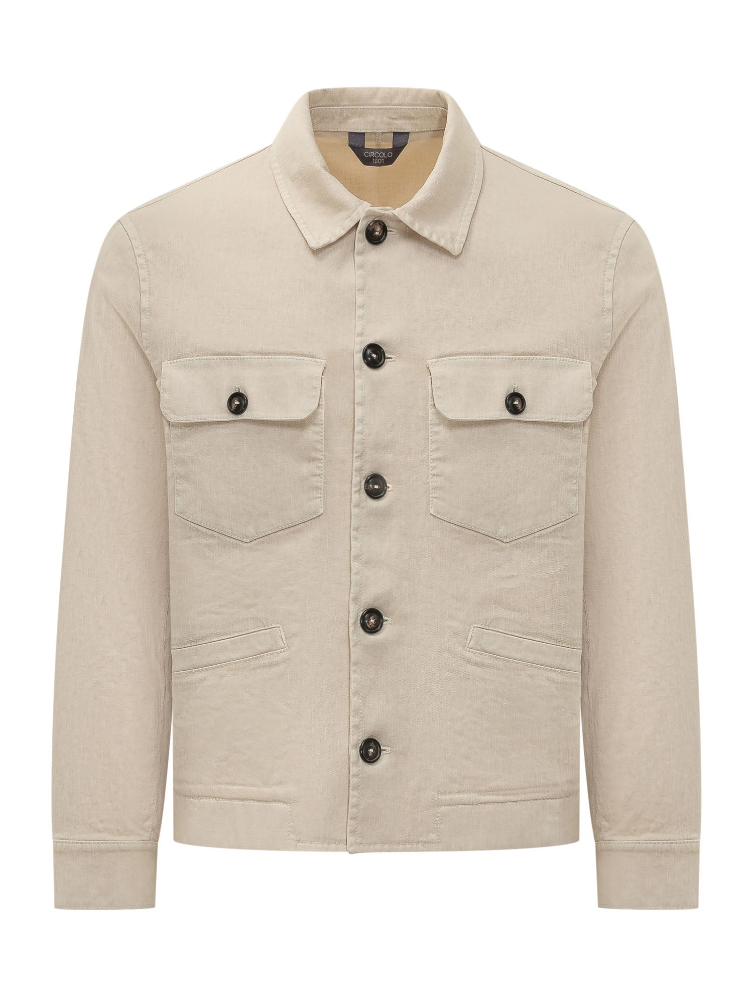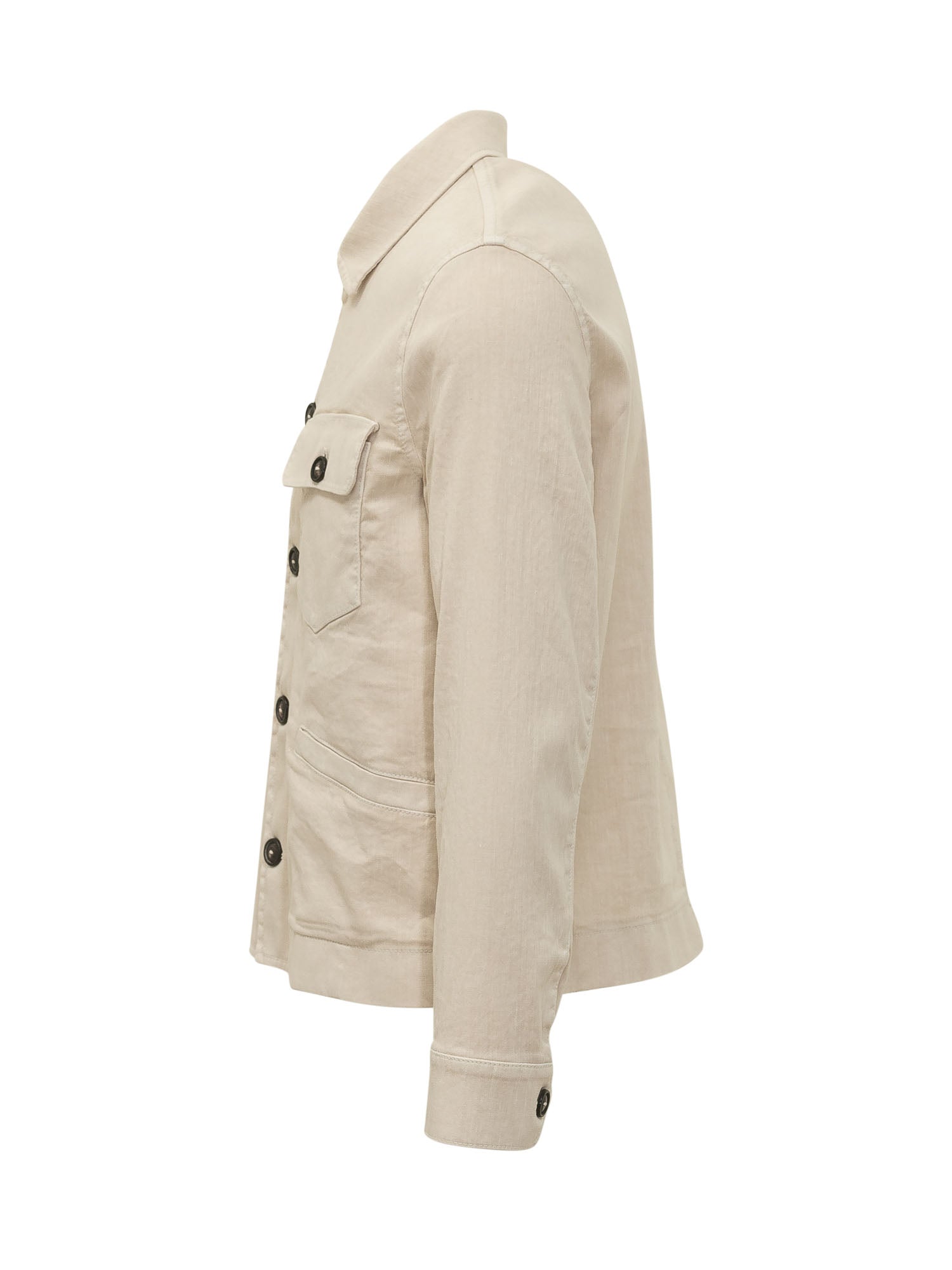 Giacca con colletto classico, chiusura frontale con bottoni, tasche sul petto con patta e tasche laterali, struttura funzionale e lineare