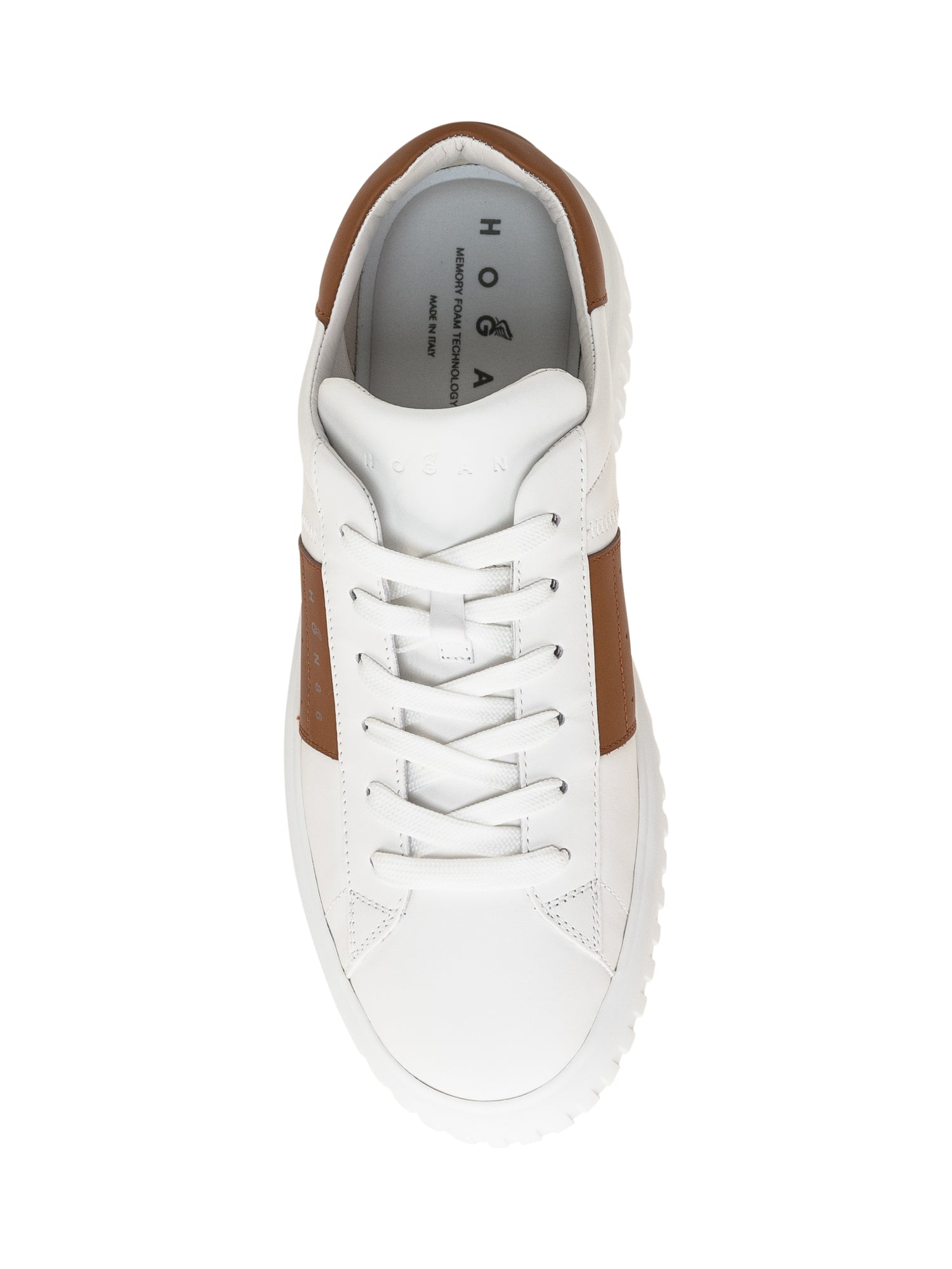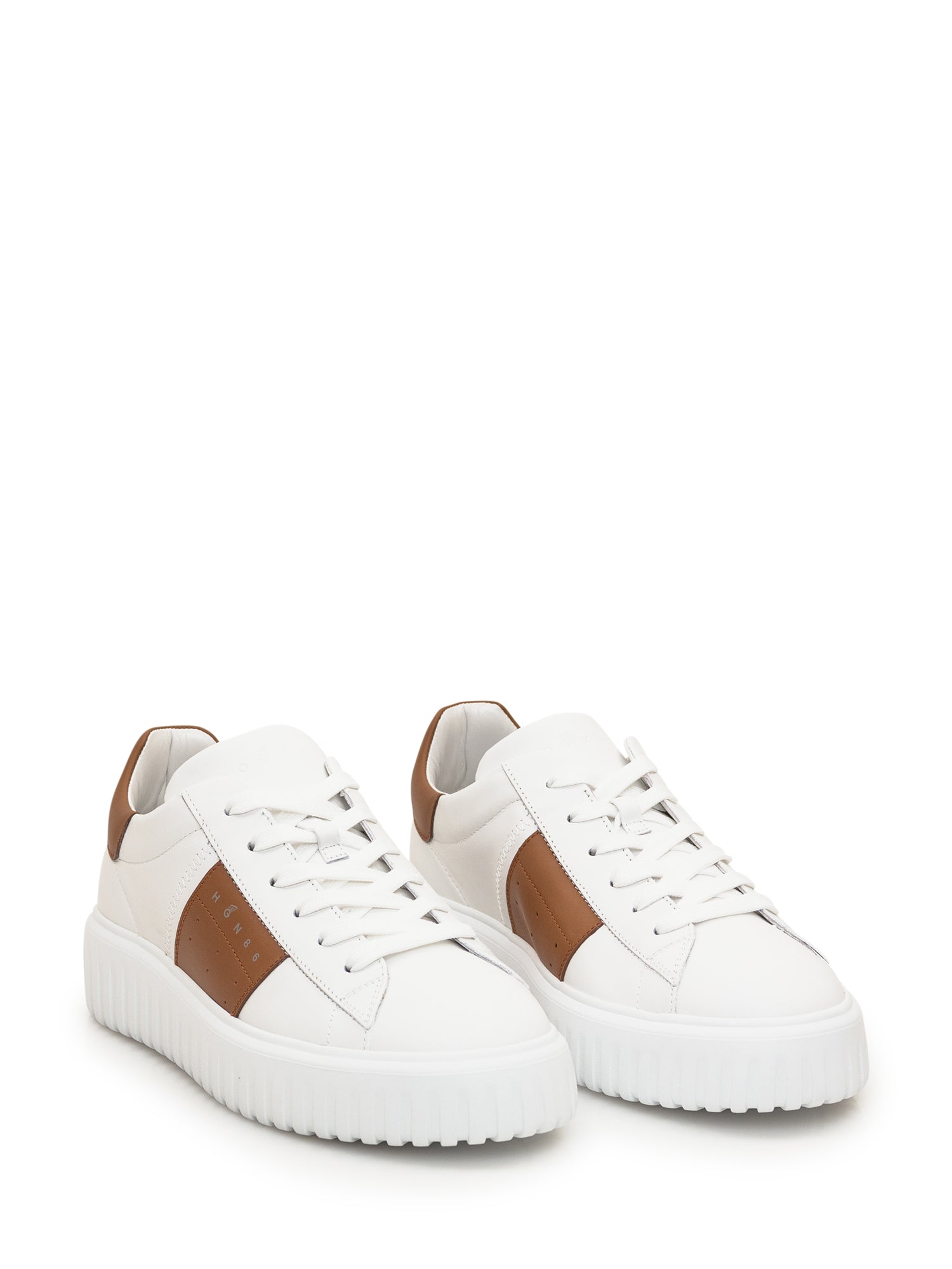 Sneaker bianca in pelle con platform. Chiusura con lacci. Tallone a contrasto. Targhetta a contrasto sul lato.