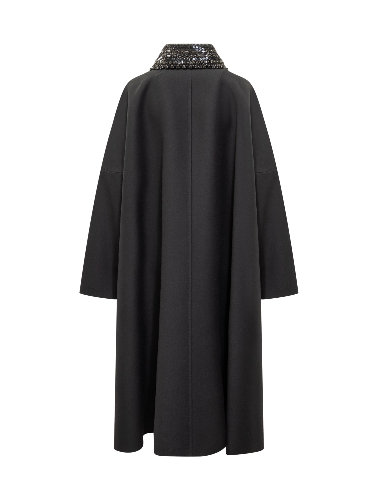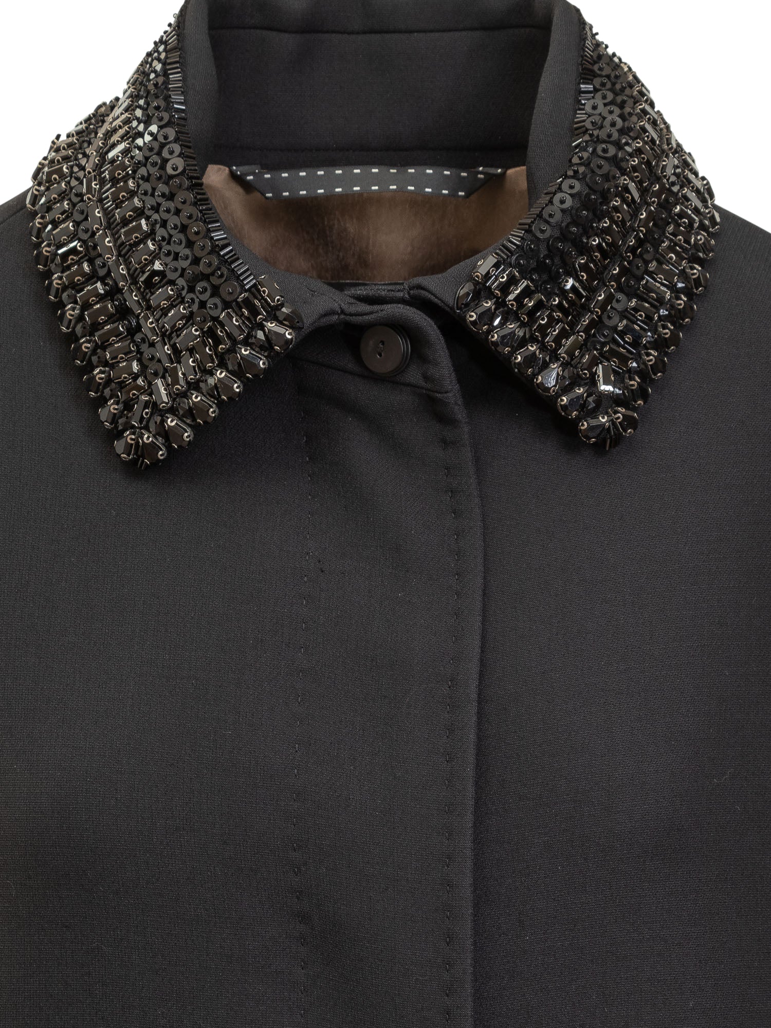 Cappotto con colletto classico. Chiusura con bottoni. Due tasche. Colletto decorato.
