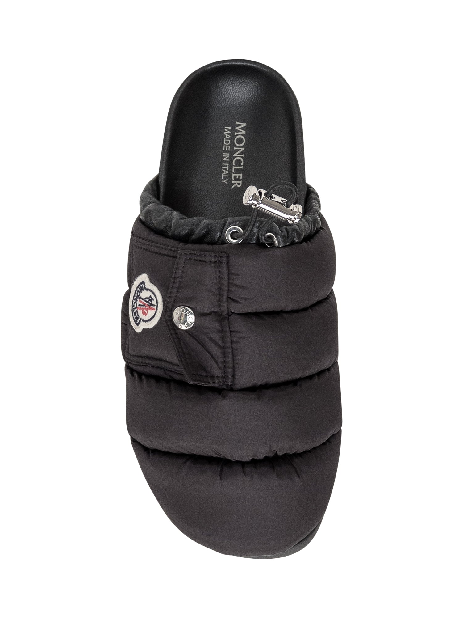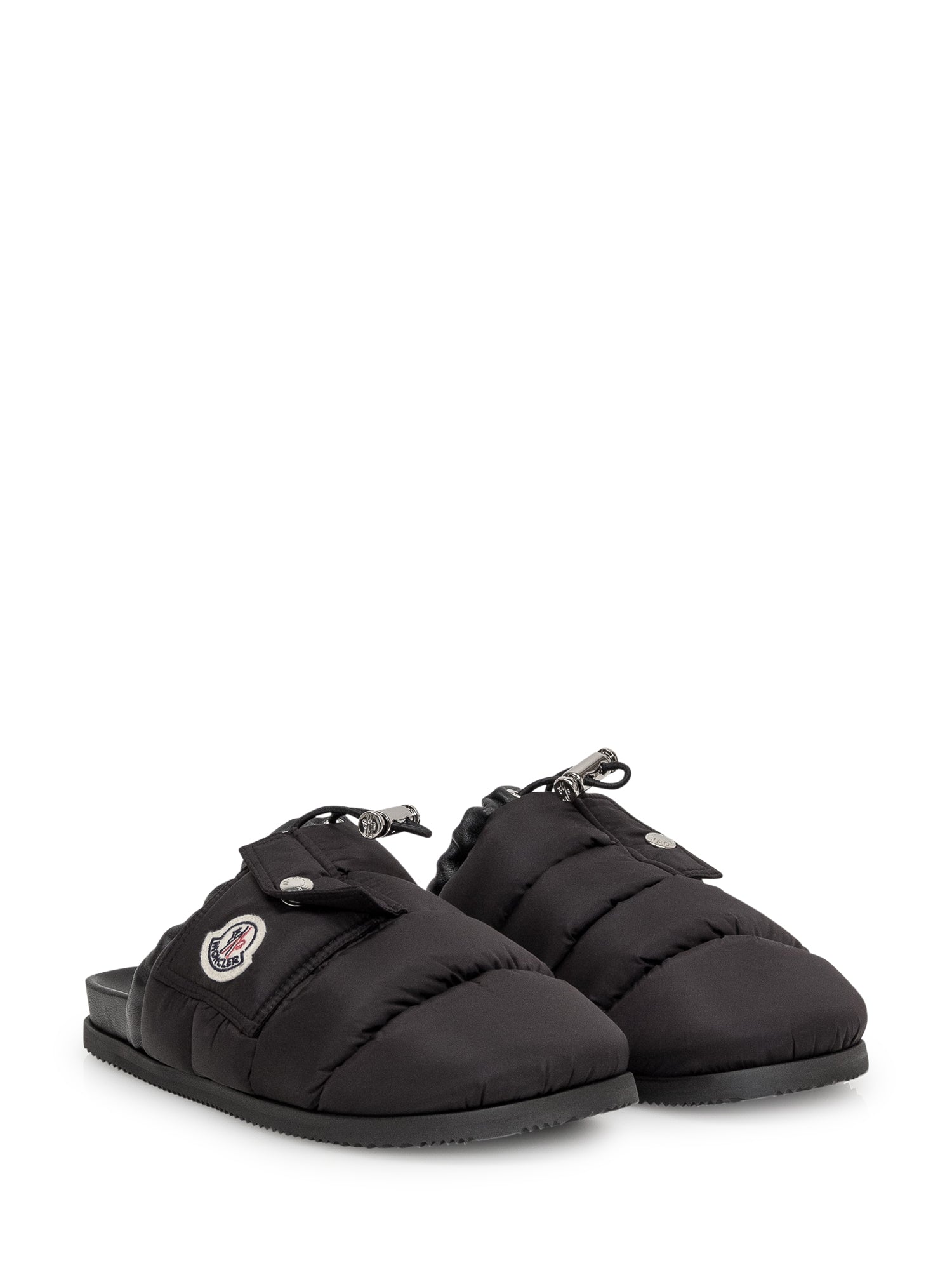 Mule nera con imbottitura. Chiusura con coulisse. Suola in gomma. Tasca con bottone automatico. Logo applicato.