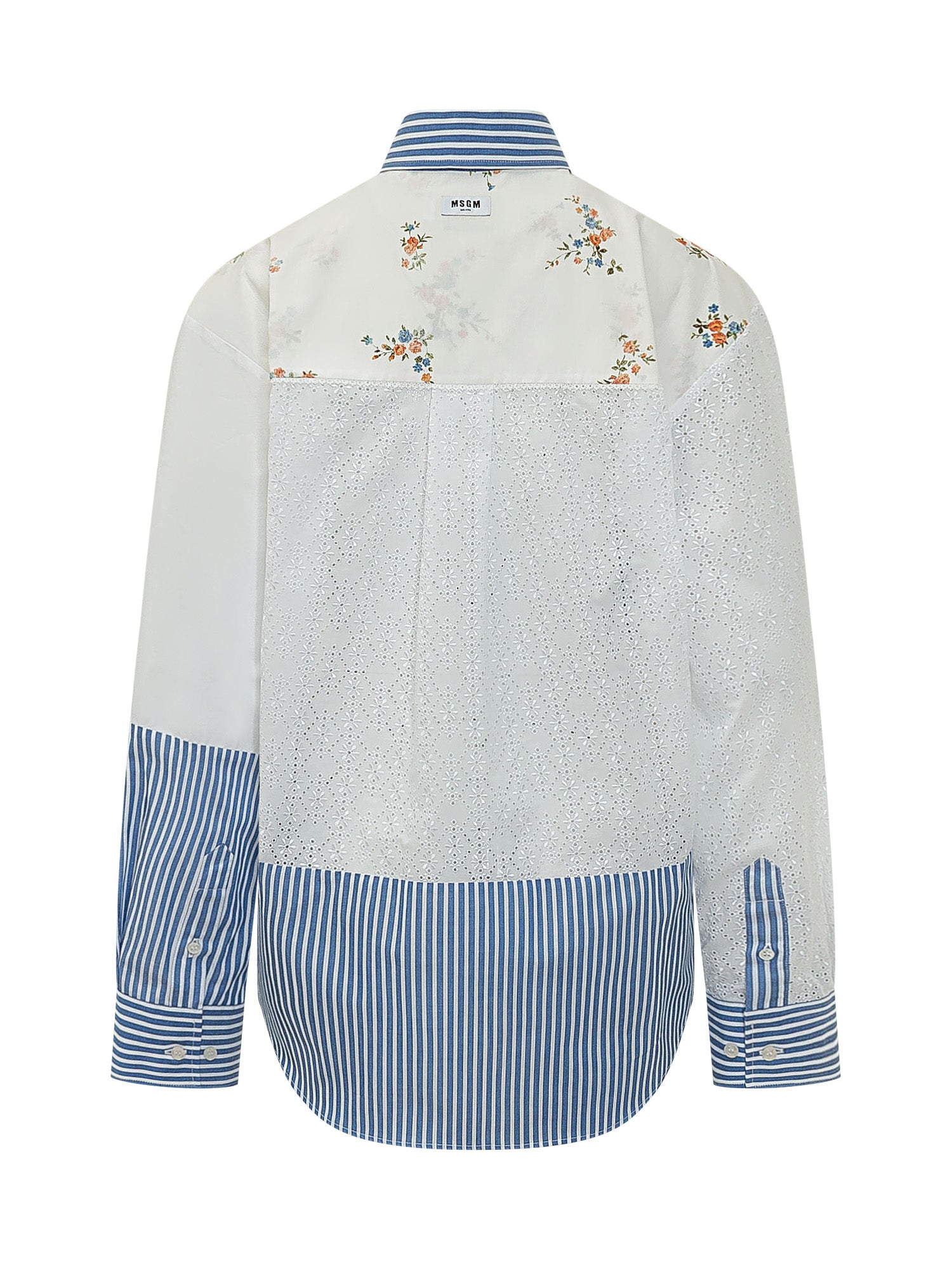 Camicia in cotone con design patchwork, inserti ricamati e dettagli a righe e fiori. Colletto classico, chiusura con bottoni e taschino applicato. Vestibilità comoda.