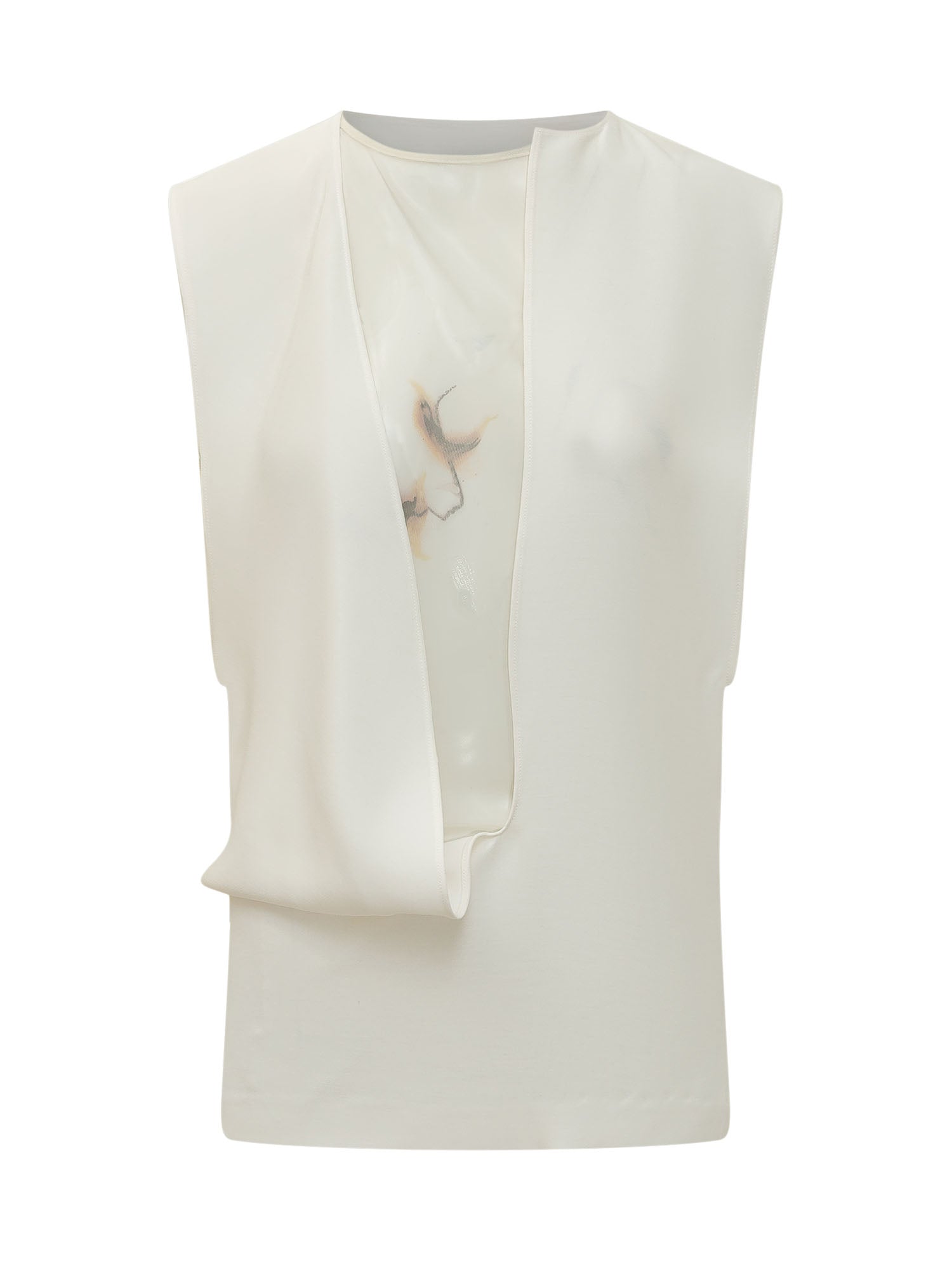Casacca dal design essenziale e contemporaneo realizzata in tessuto fluido. Il modello senza maniche presenta una profonda apertura frontale con pannello drappeggiato che crea movimento e dona un effetto elegante e sofisticato. La linea morbida la rende ideale da abbinare sia a pantaloni sartoriali che a look più casual per uno stile moderno e raffinato.