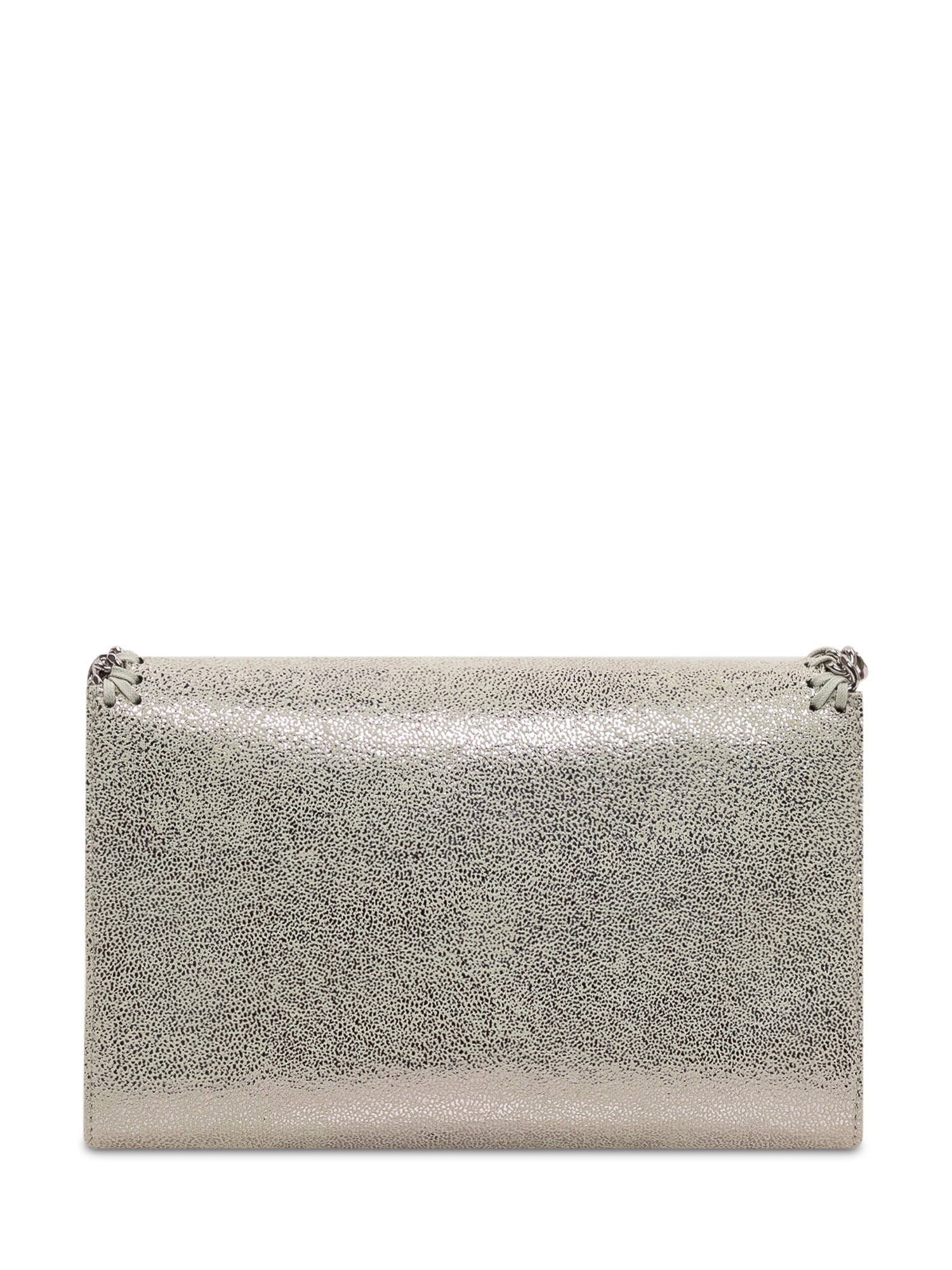 Portafoglio Falabella con patta frontale, profilo con catena metallica e medaglia pendente. Struttura compatta con cuciture decorative.