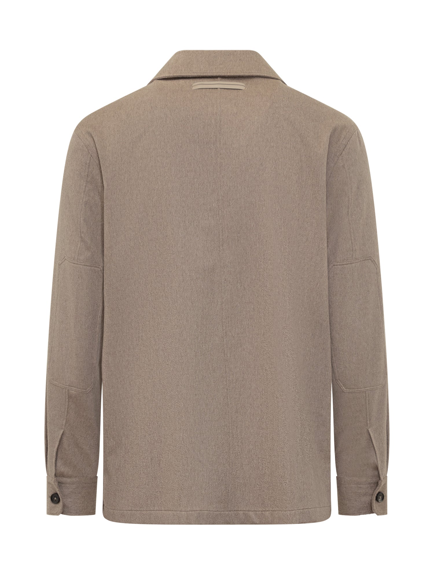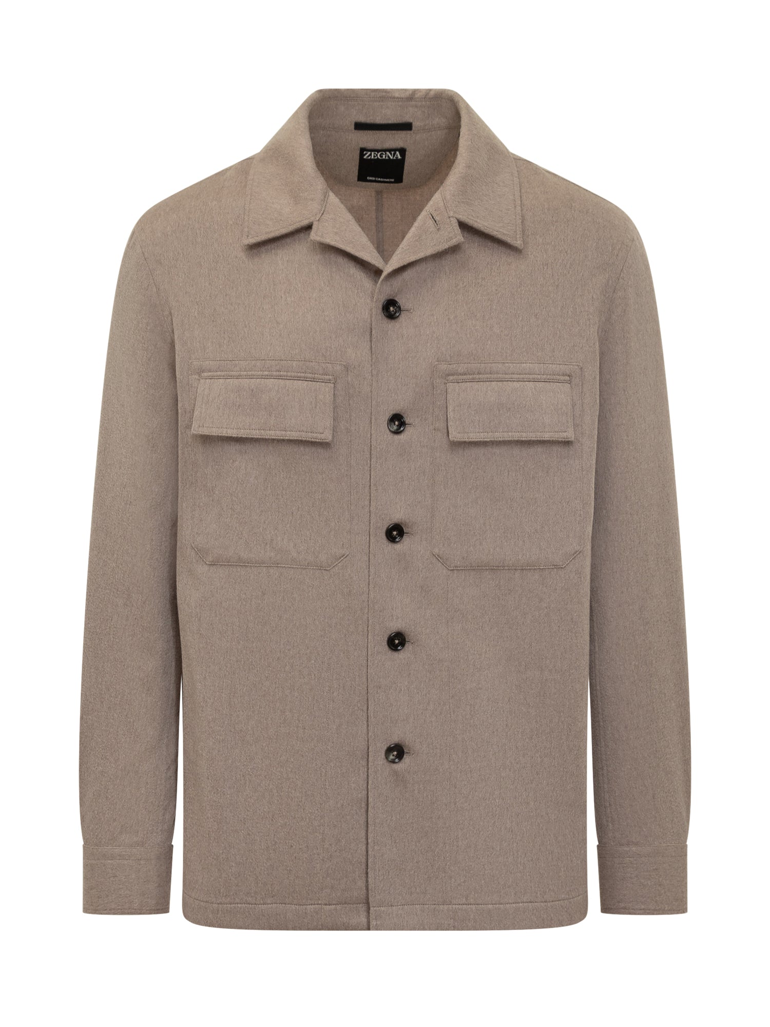 Overshirt Zegna in lana beige con bottoni frontali e tasche applicate. Un capo versatile dal design raffinato.