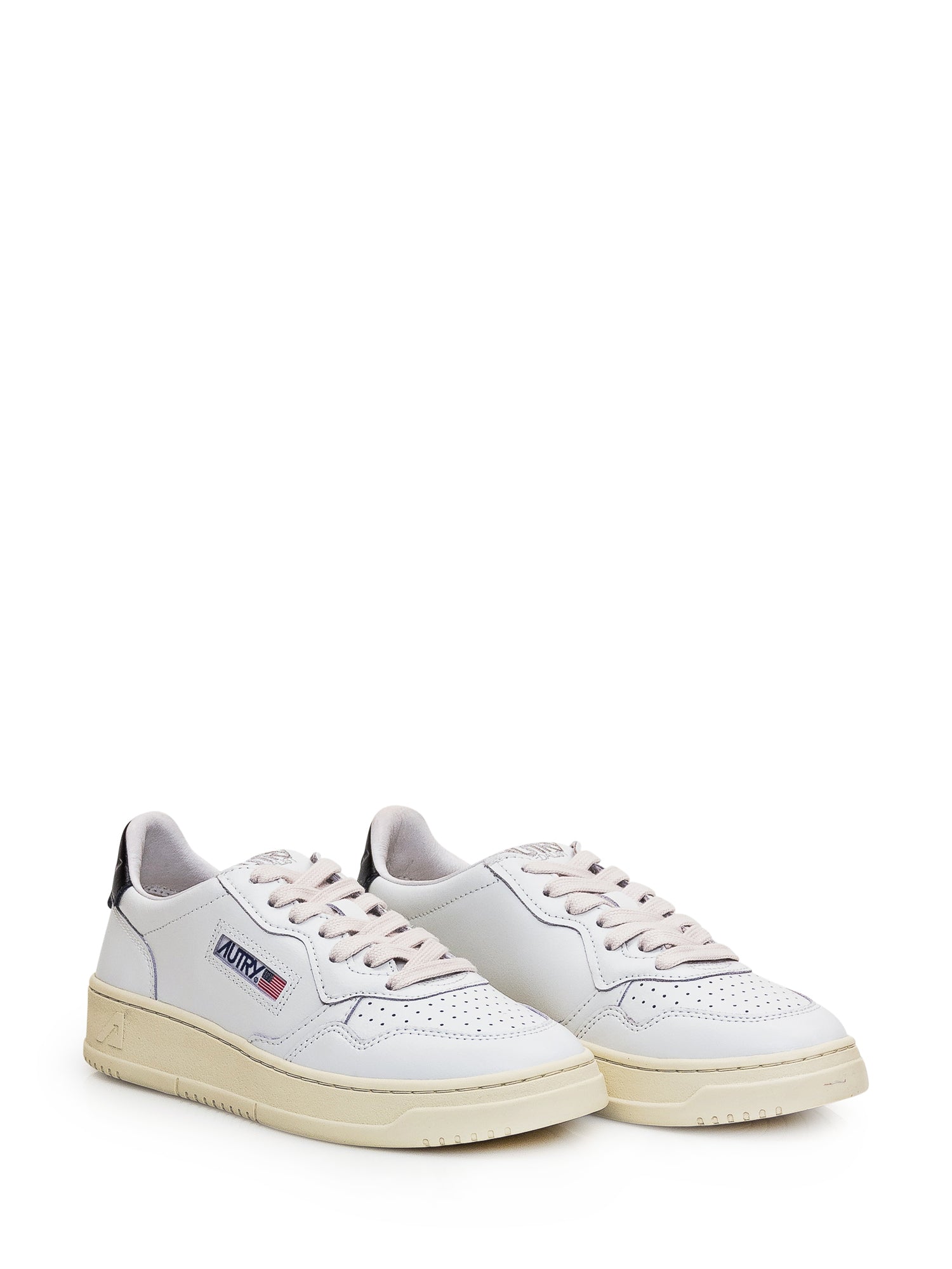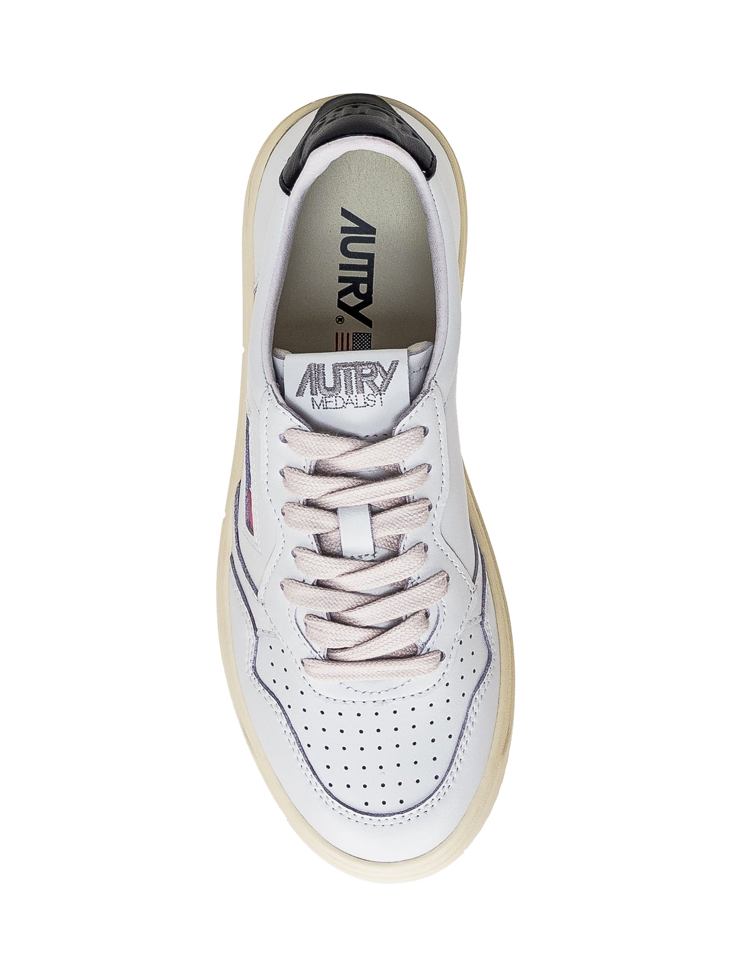 Sneaker bianca in pelle. Punta traforata. Chiusura con lacci. Tallone a contrasto. Logo sulla linguetta, sul tallone e sul lato.