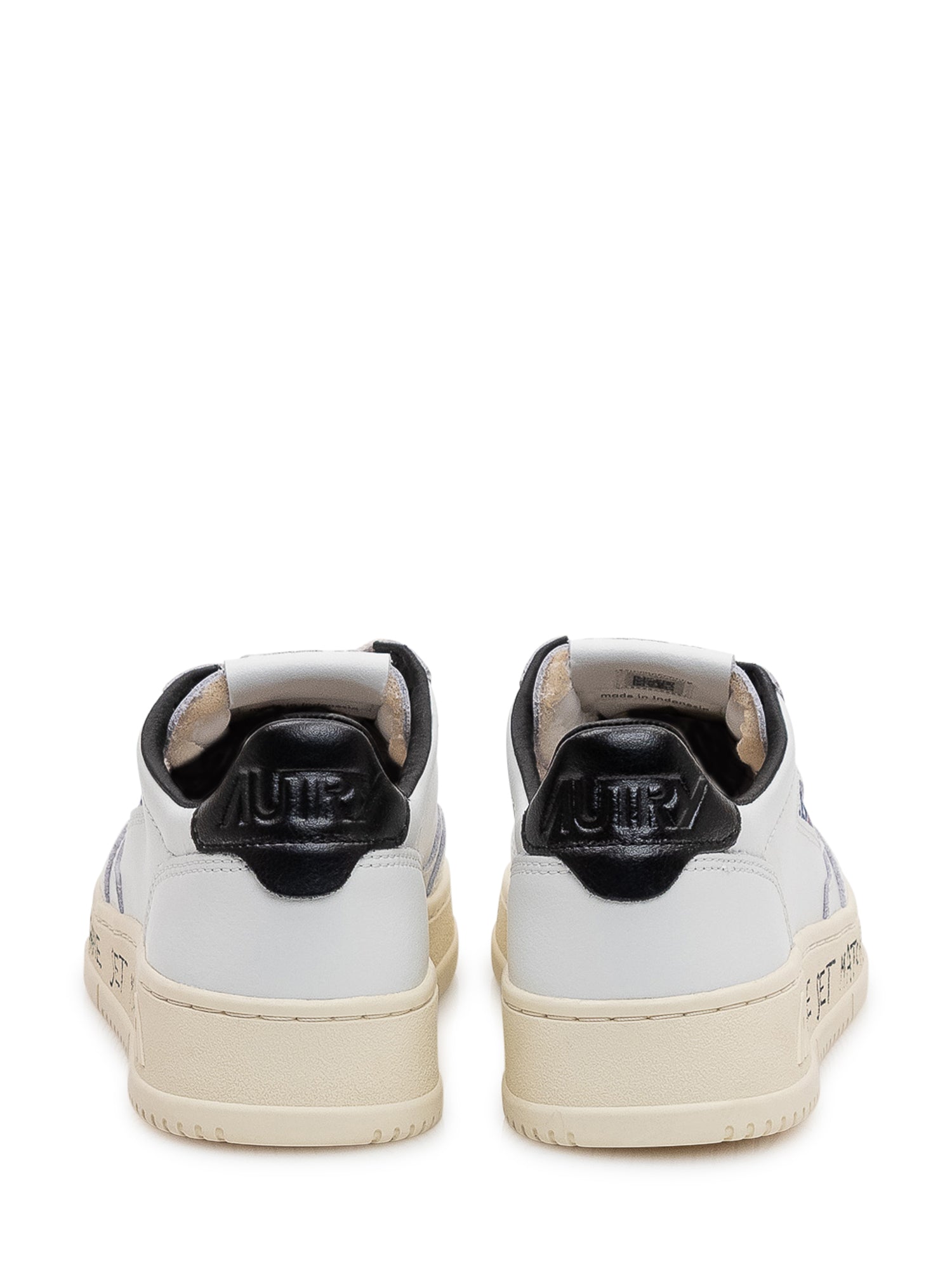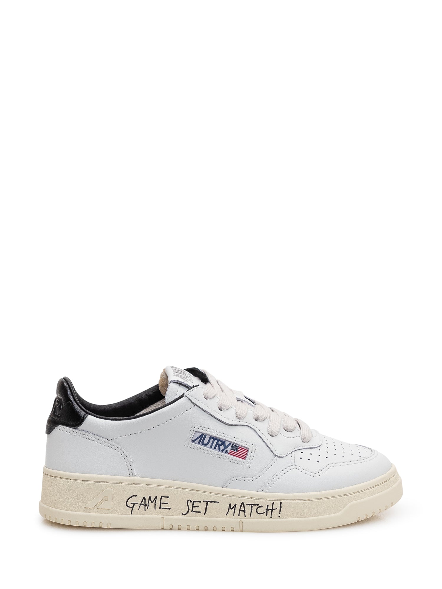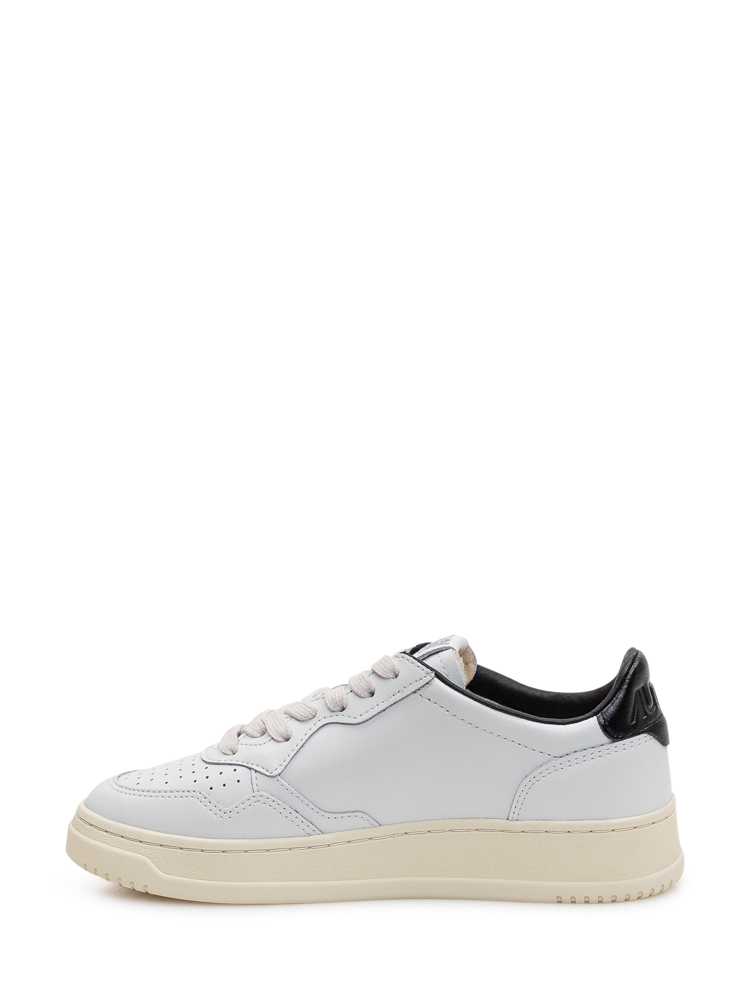 Sneakers basse in pelle con punta traforata e suola piatta. Tallone a contrasto e scritta laterale dal carattere sportivo.