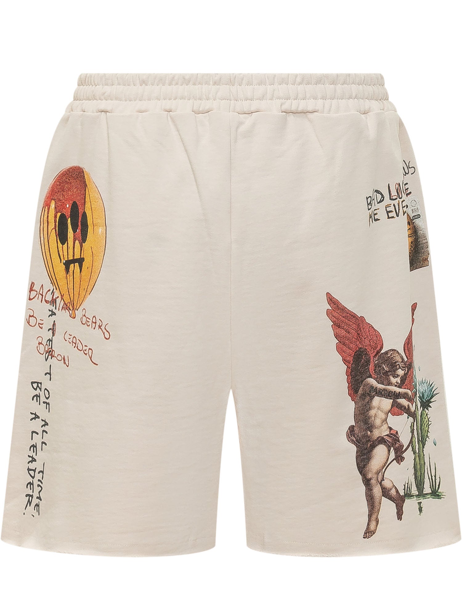 Bermuda in felpa con vita elasticizzata, stampa grafica frontale con scritte e illustrazioni, design casual con dettagli decorativi multipli