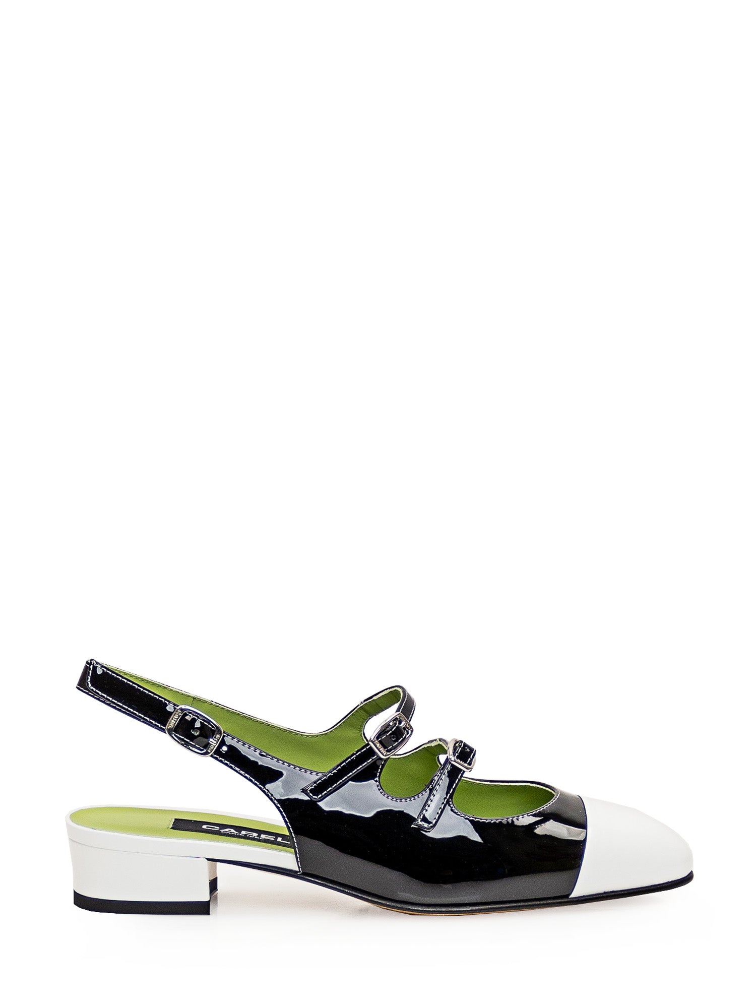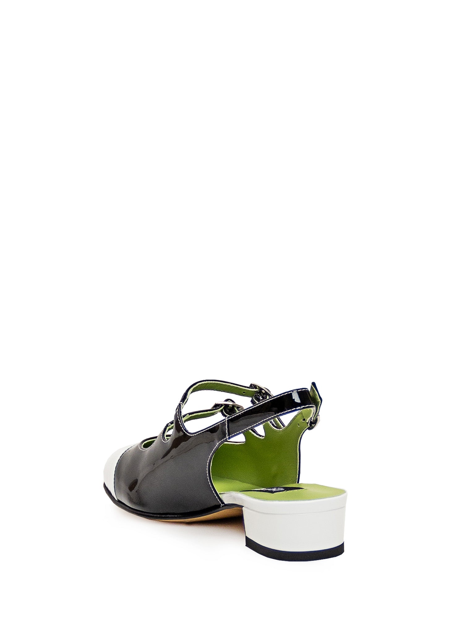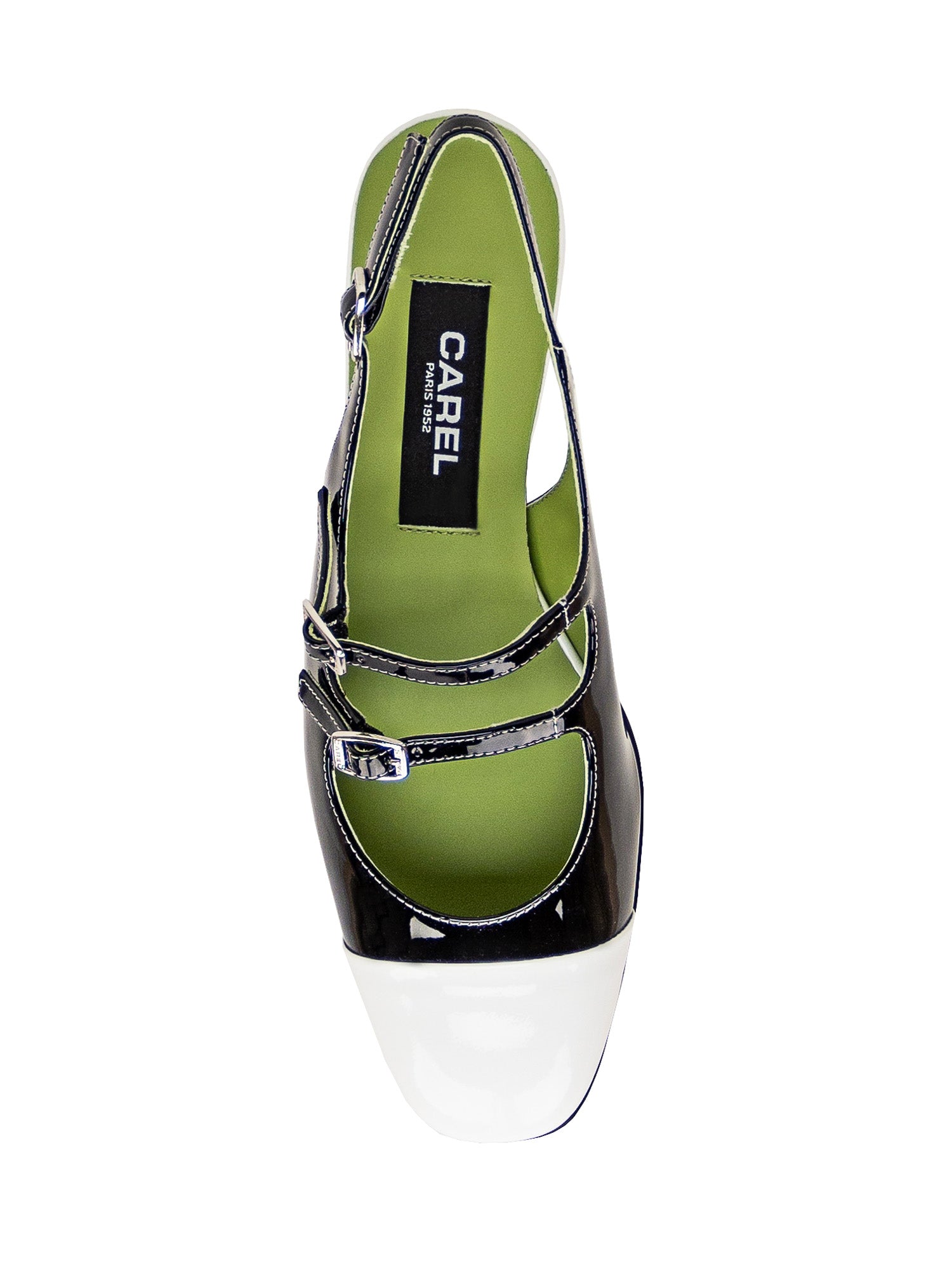 Pump nera in pelle. Punta rotonda. Tre cinturini regolabili. Tacco basso. Patch logo sulla suola interna.