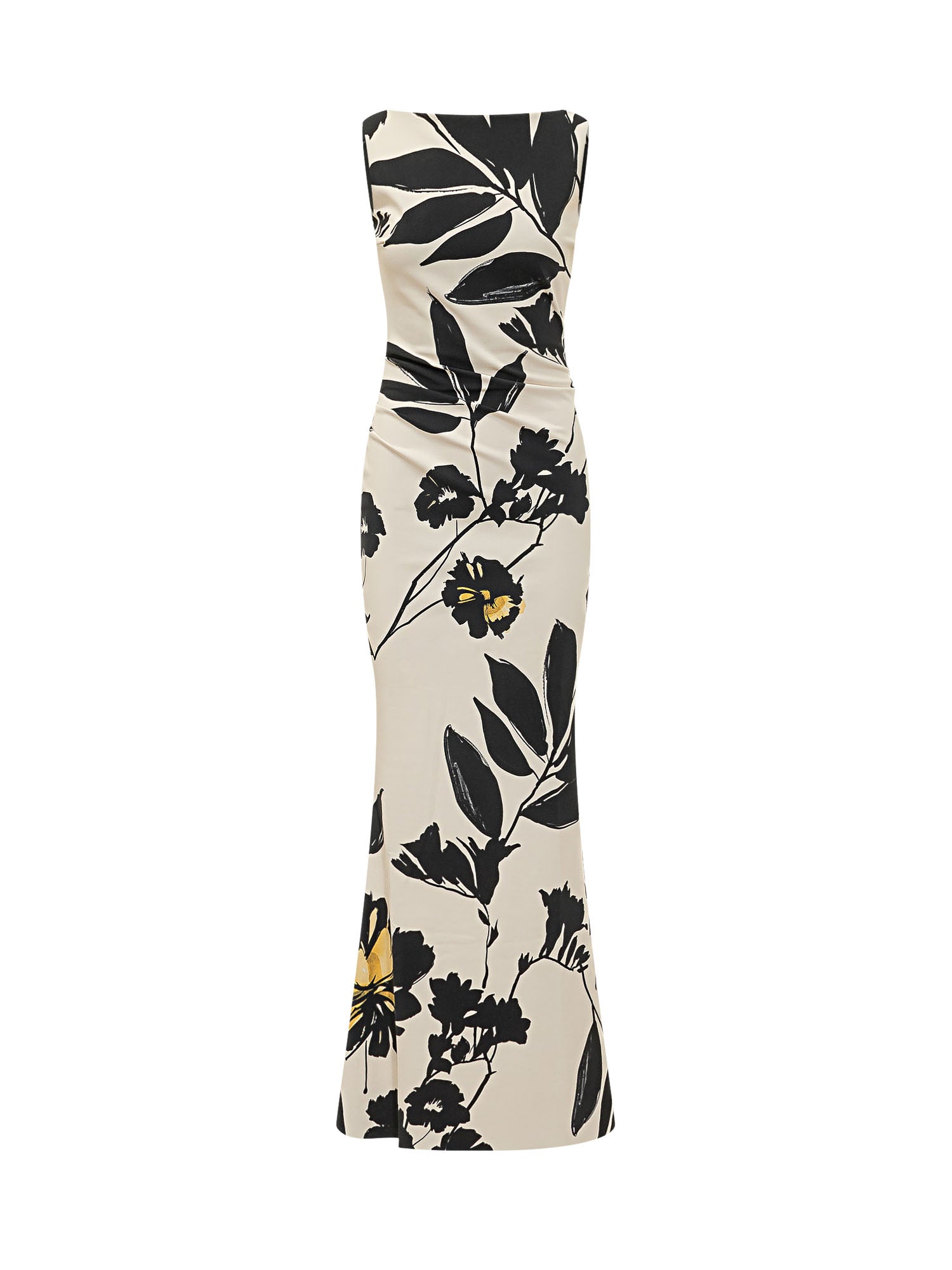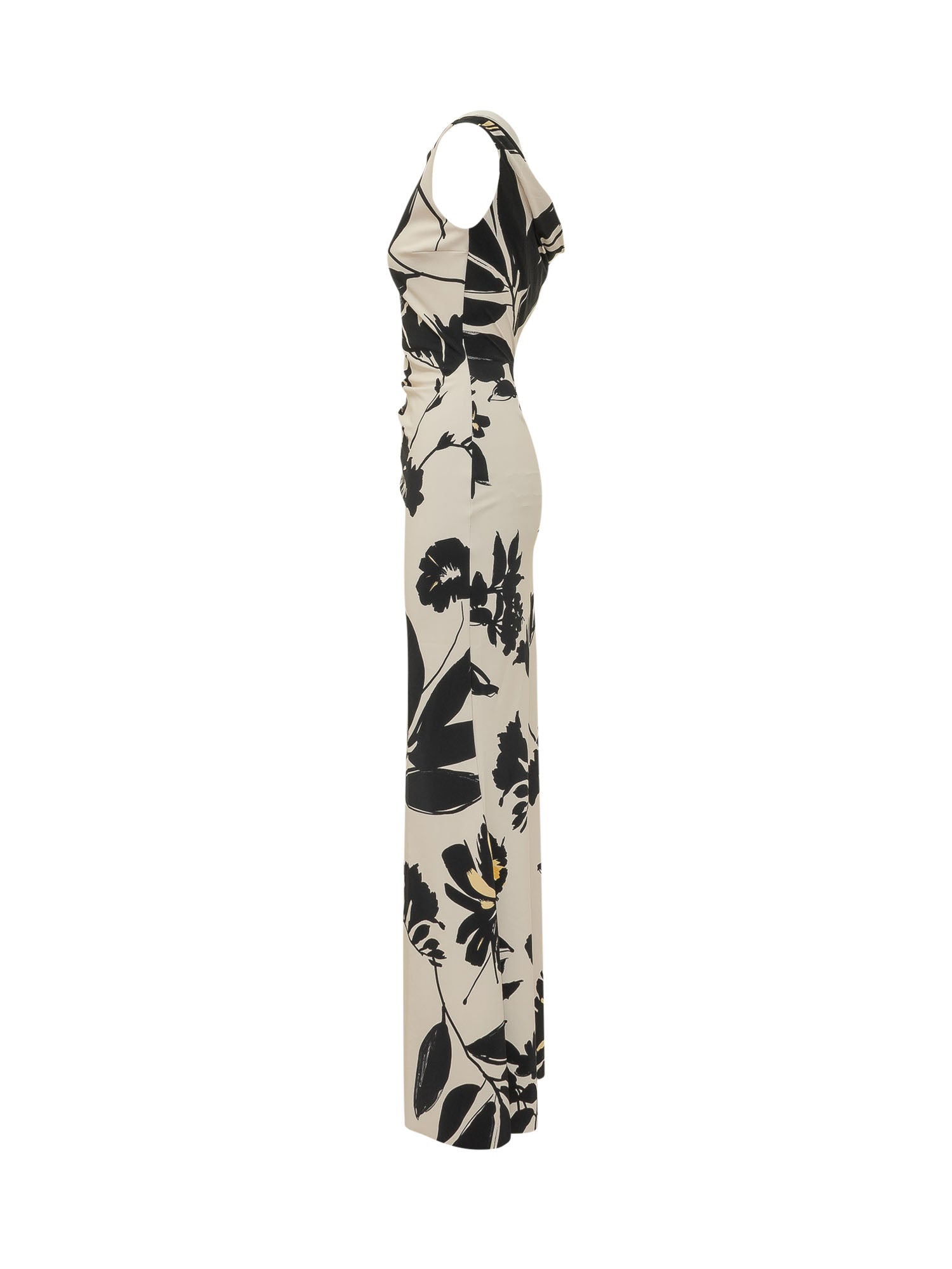 Abito lungo senza maniche con scollo a barca e design aderente. Drappeggio laterale in vita e motivo floreale all over che valorizza la silhouette. Ideale per occasioni eleganti e look formali.