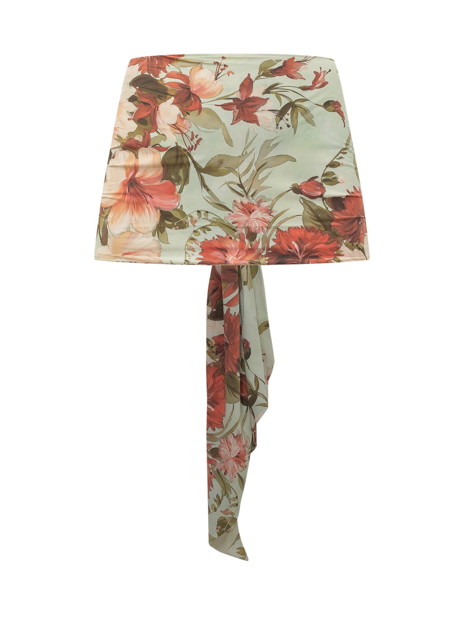Stola in jersey con stampa floreale multicolor su base verde salvia, impreziosita da nodo frontale e drappeggio morbido. Modello avvolgente e femminile, ideale per completare look eleganti e da cerimonia con un tocco romantico.