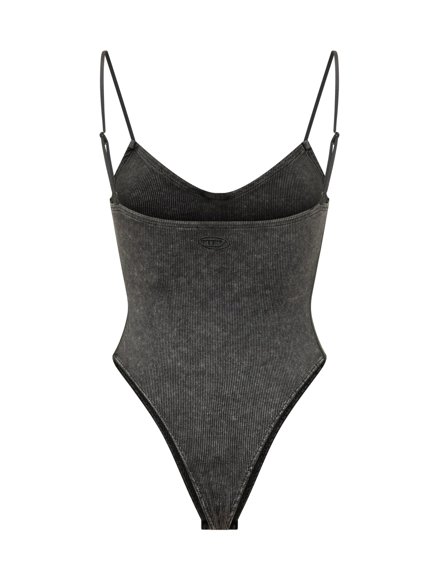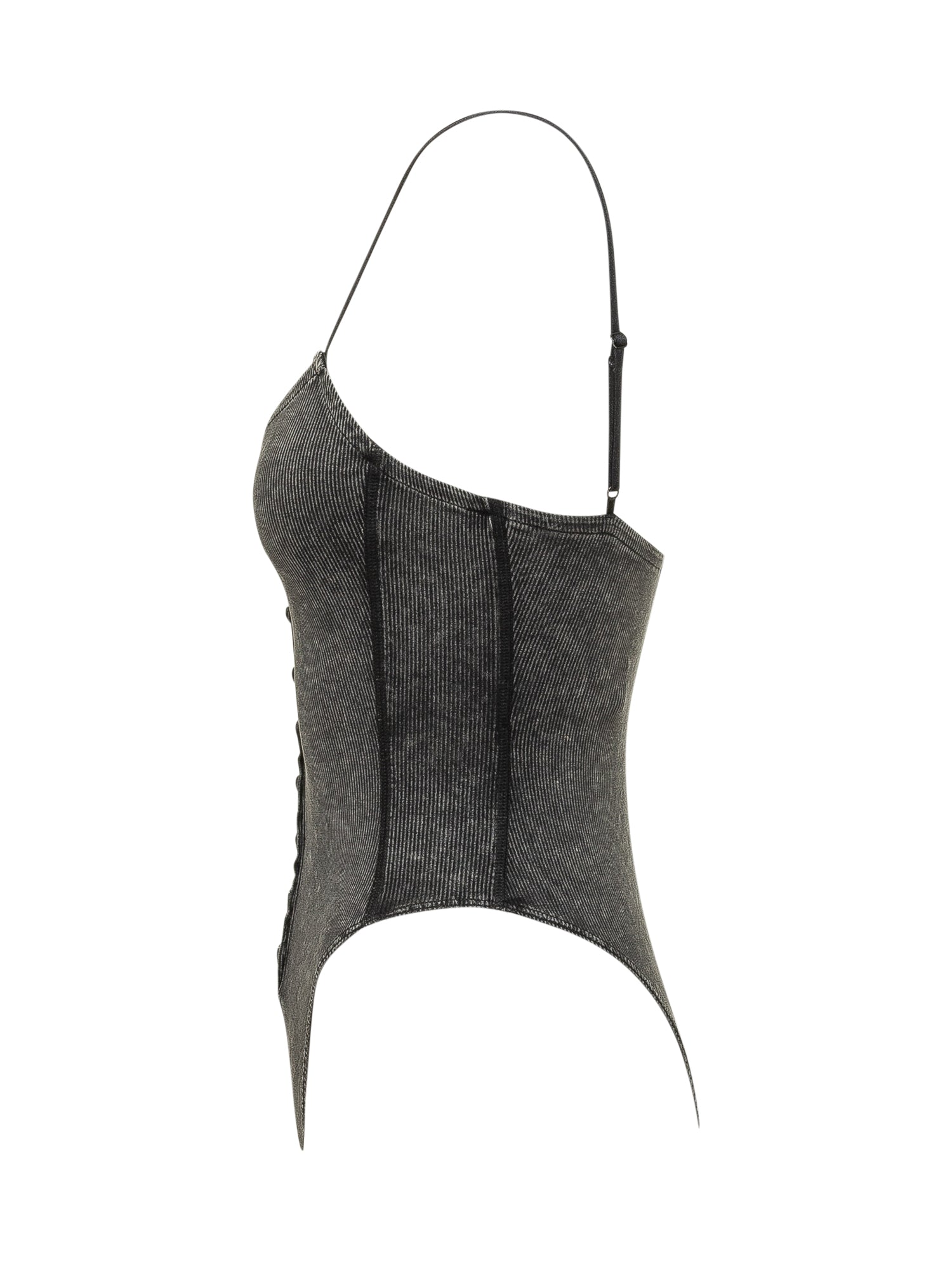 Top modello body con spalline sottili e chiusura frontale. Vestibilità aderente.