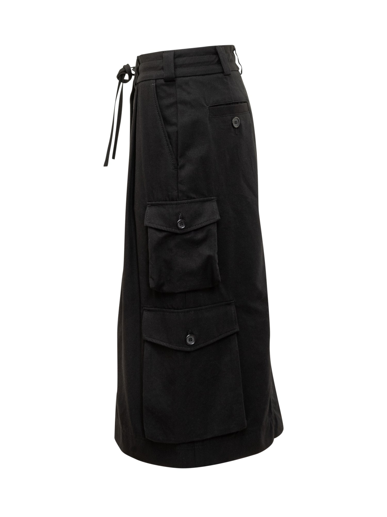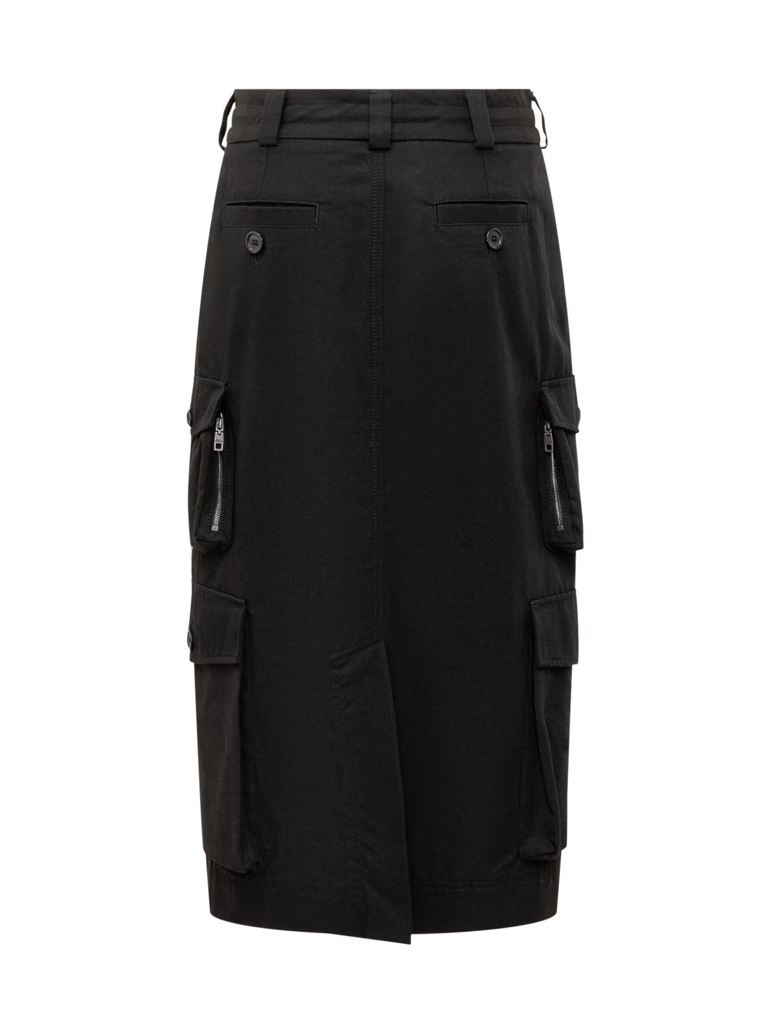 Gonna Dolce & Gabbana in cotone nero con vita regolabile e coulisse. Tasche laterali cargo con zip.
