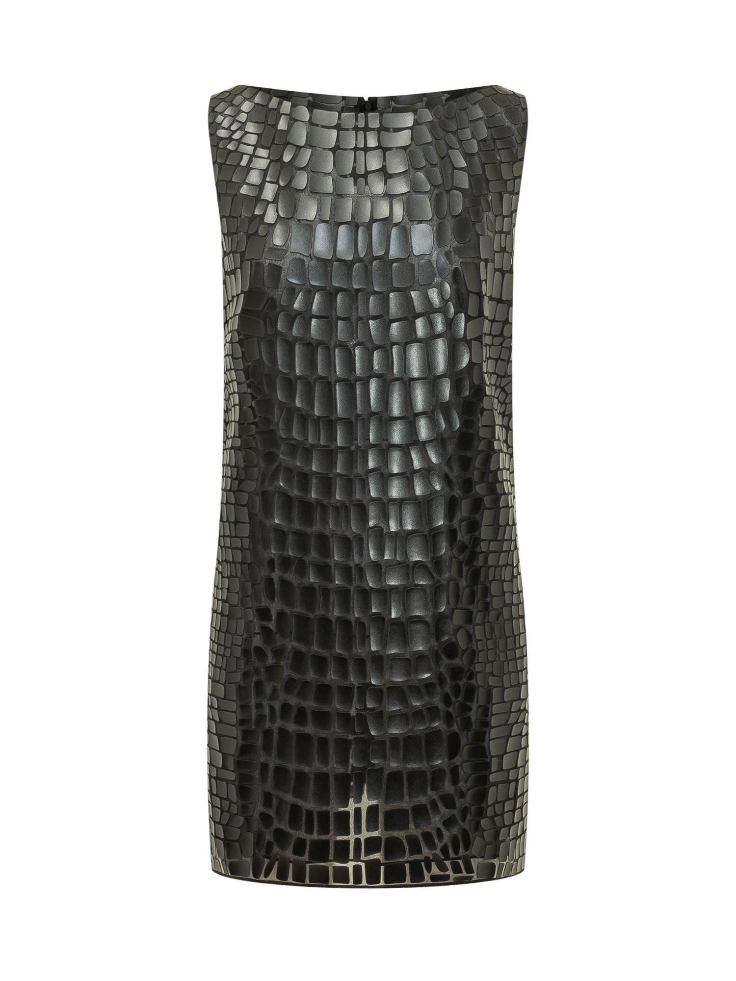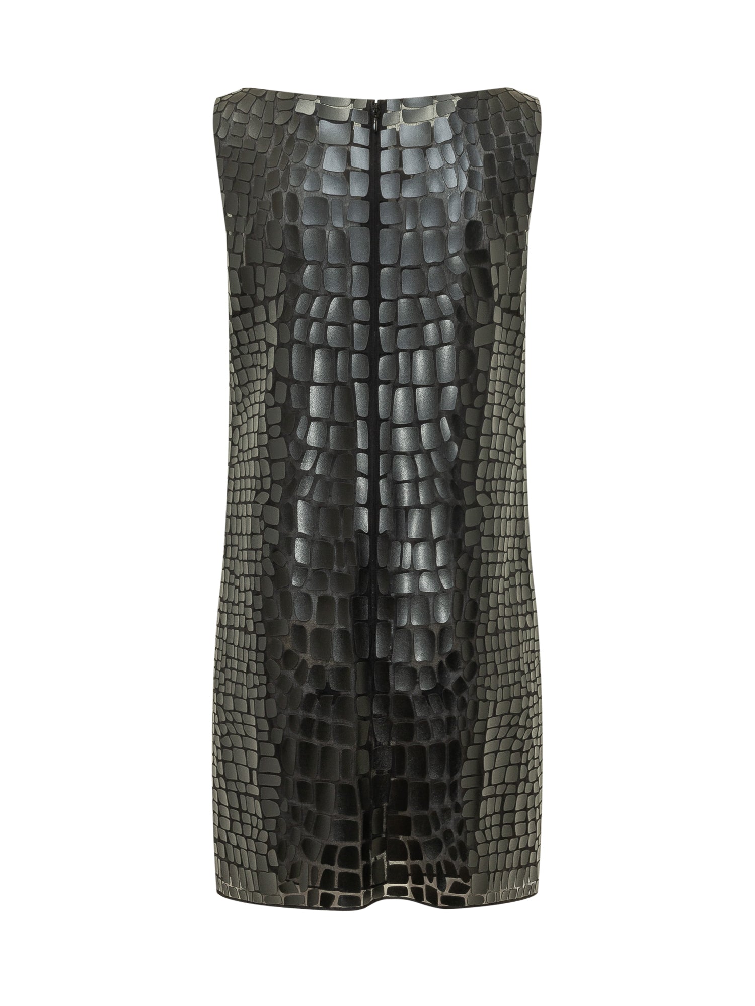 Abito smanicato a tubino con effetto coccodrillo in rilievo. Linea aderente e pulita che valorizza la silhouette.