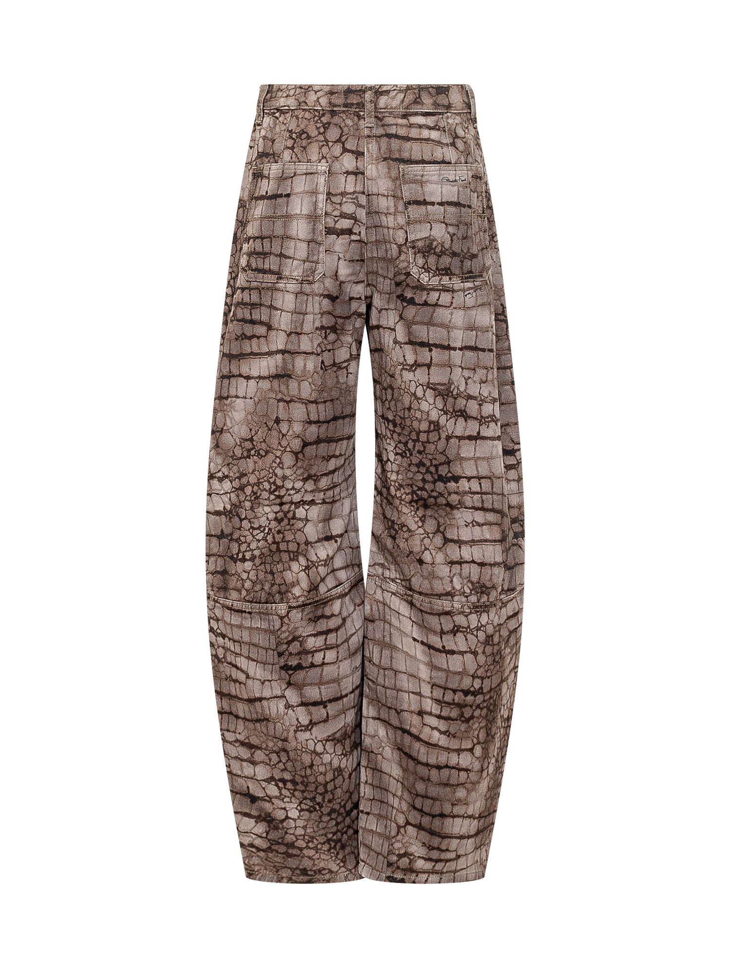 Jeans a vita alta con gamba ampia e taglio balloon, motivo effetto pelle con texture animalier, cuciture a pannelli che definiscono la linea, chiusura con bottone e zip.