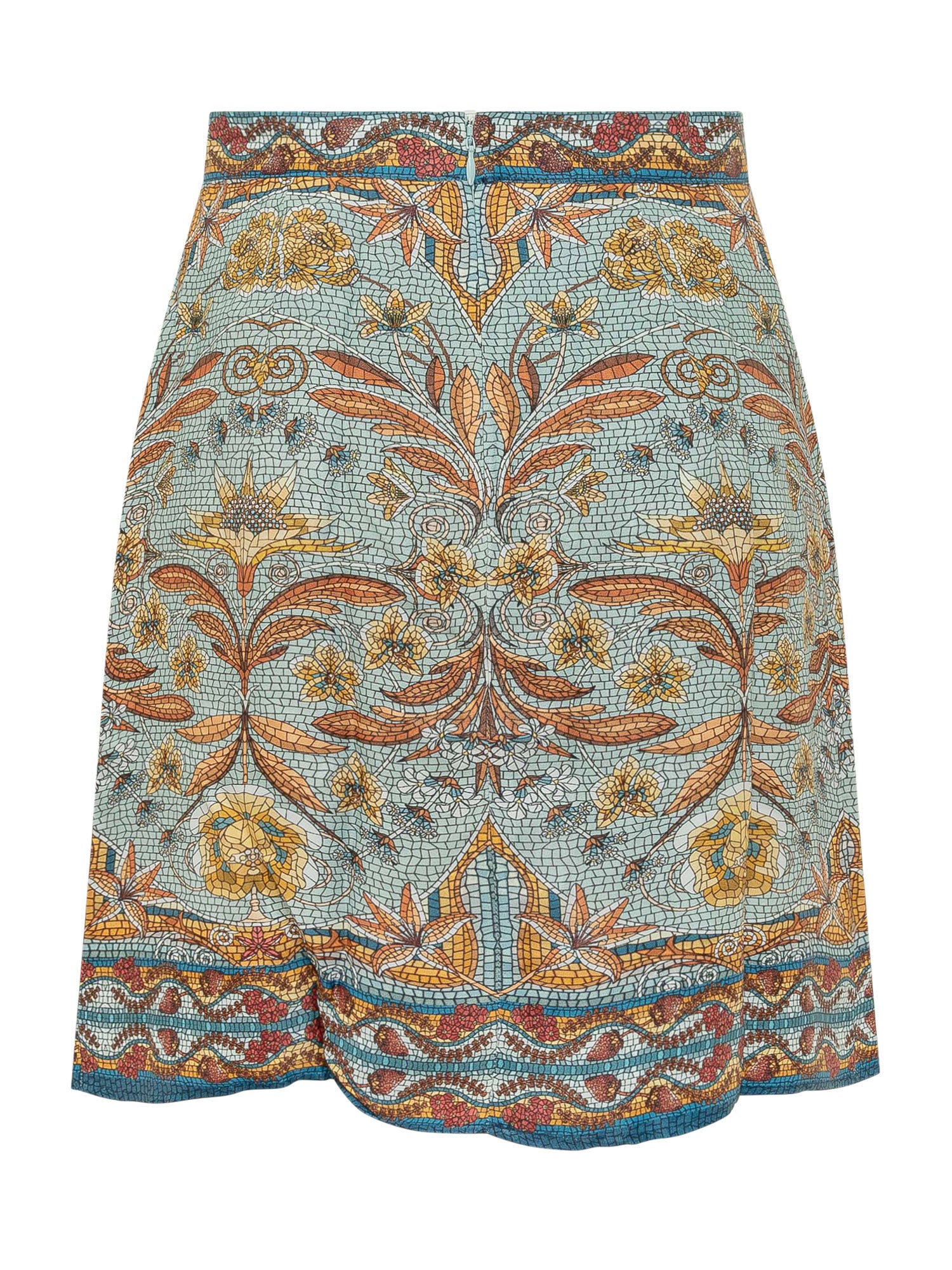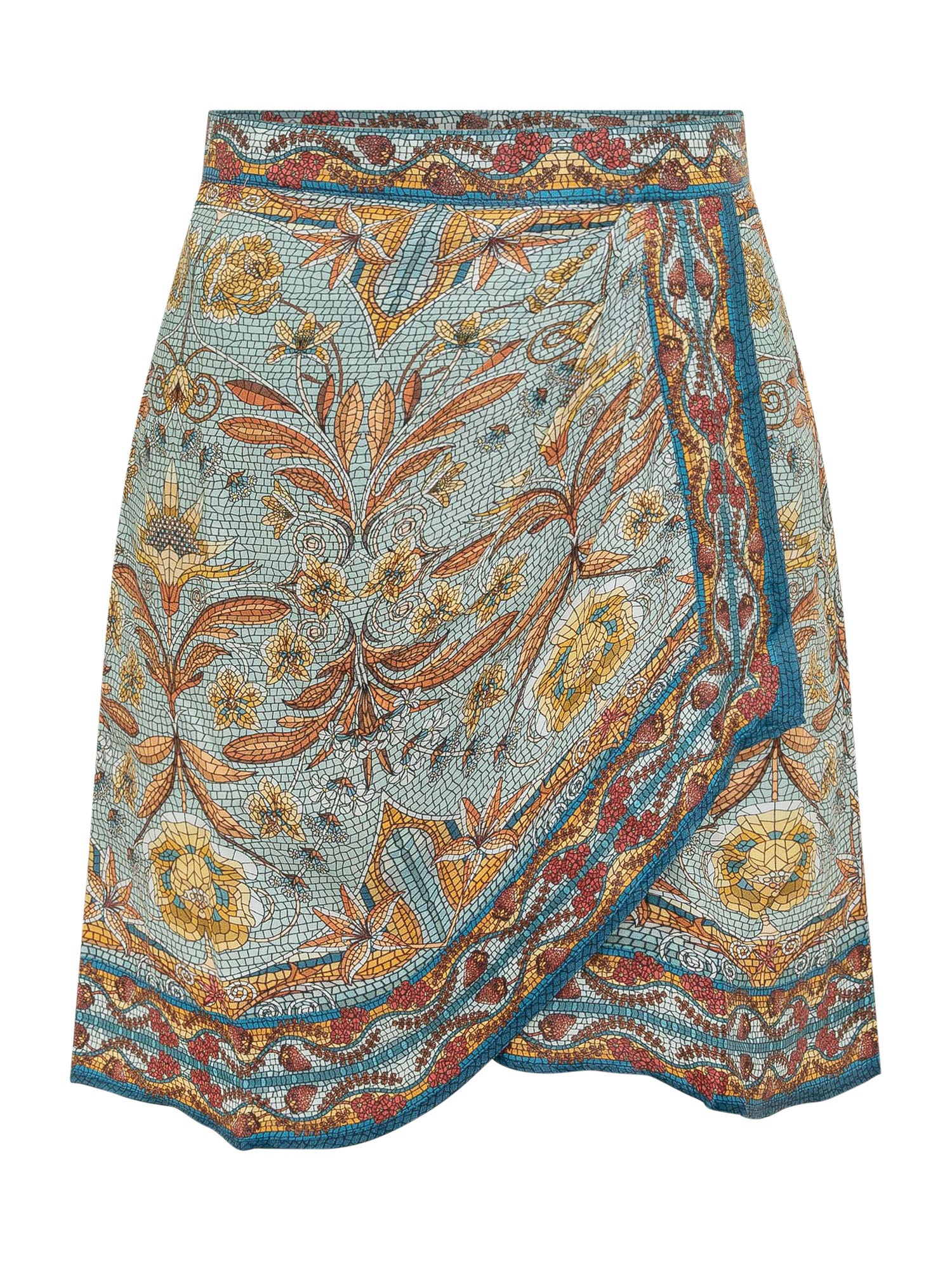 Mini gonna avvolgente in cotone con stampa effetto mosaico. Modello a portafoglio con dettaglio smerlato sul bordo e vestibilità femminile.