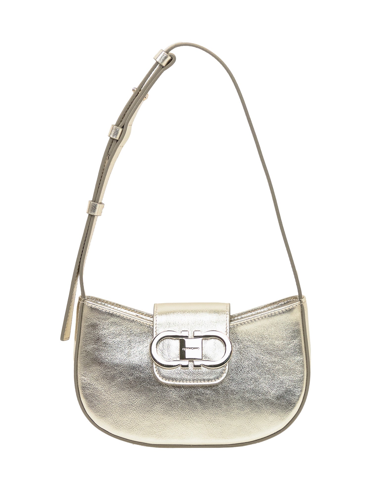 Borsa a spalla dal design compatto con silhouette curva e patta frontale decorata da dettaglio metallico. La tracolla regolabile permette un uso versatile.