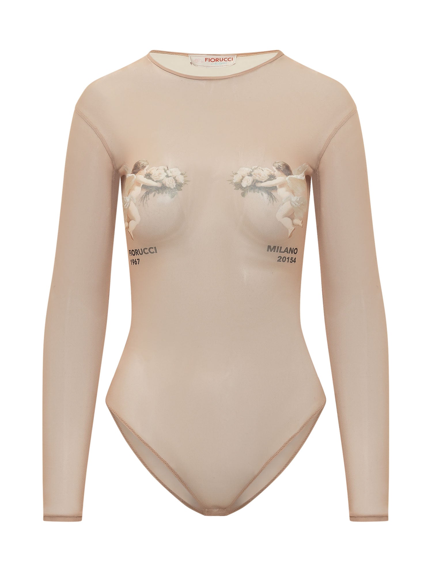 Body a maniche lunghe con scollo tondo, stampa grafica frontale con figure e scritte, design aderente