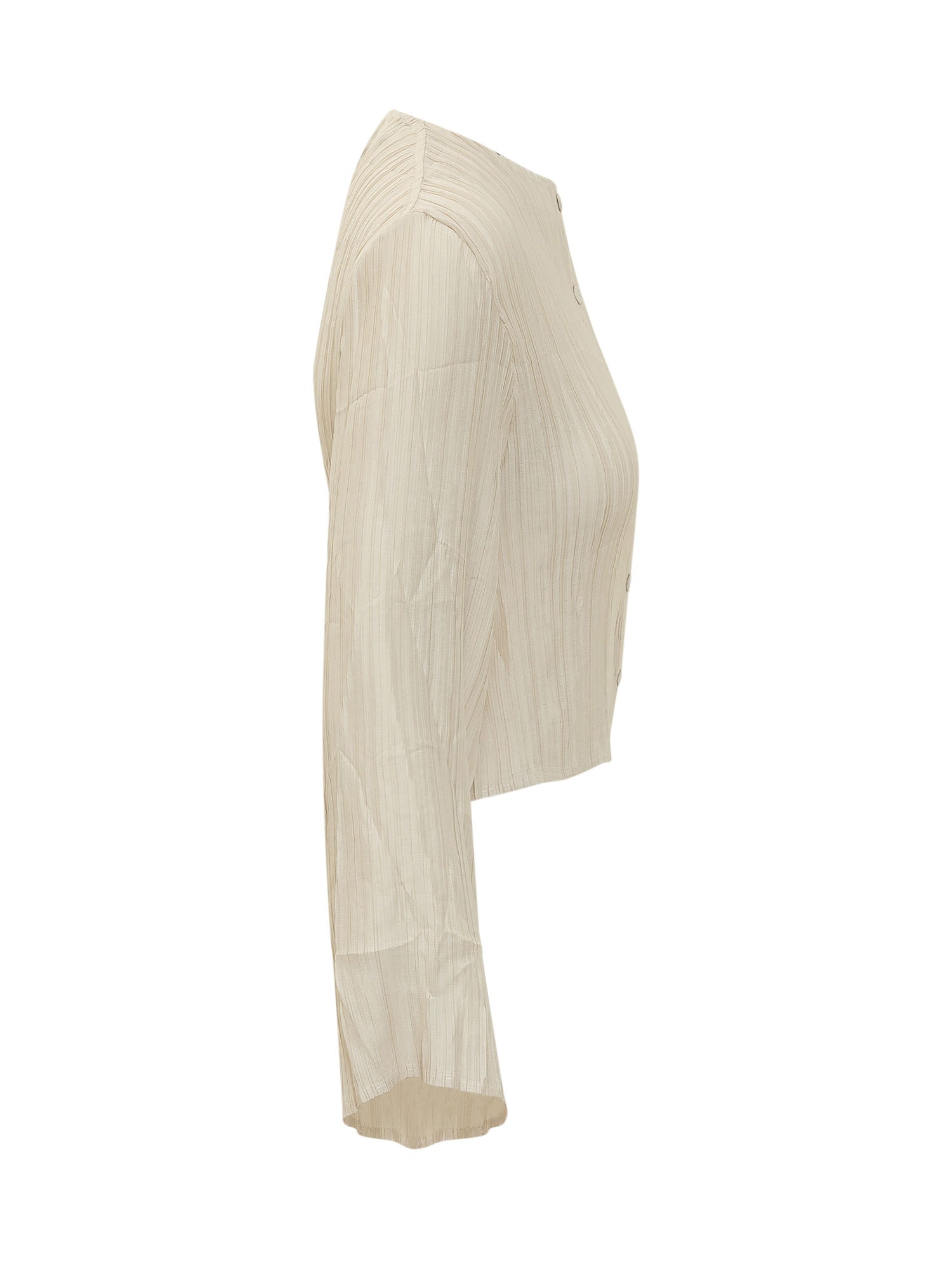 Top corto con lavorazione a coste verticali, maniche lunghe, chiusura frontale con bottoni, linea aderente