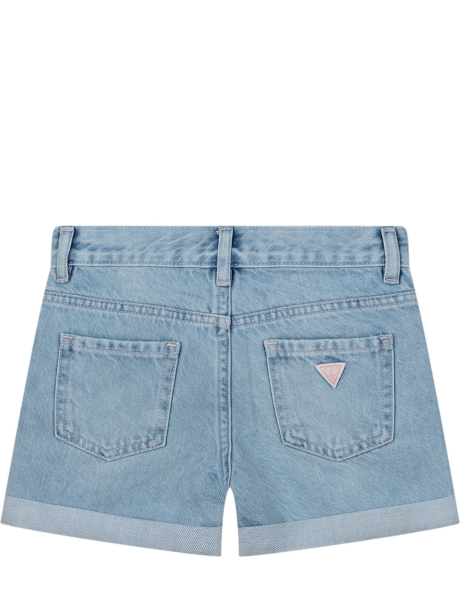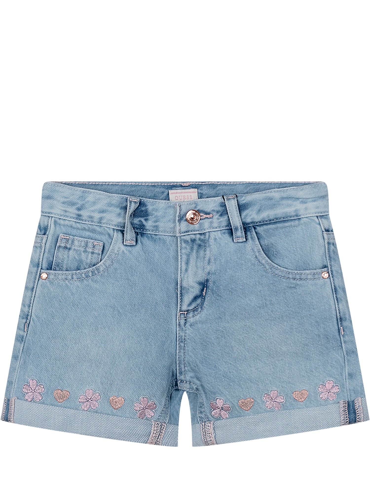 Shorts in denim rigido con tasche, chiusura con bottone e zip, dettagli ricamati con fiori e cuori sul fondo, stile casual e delicato