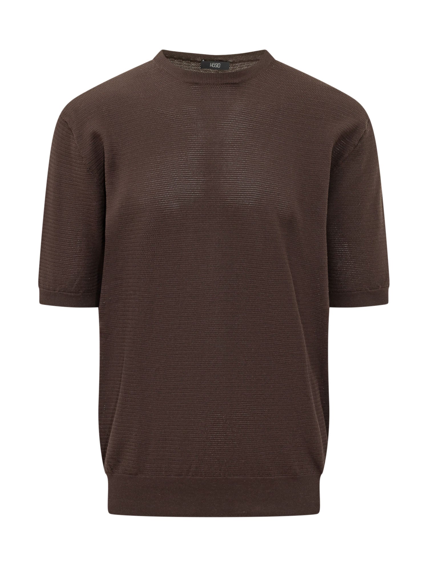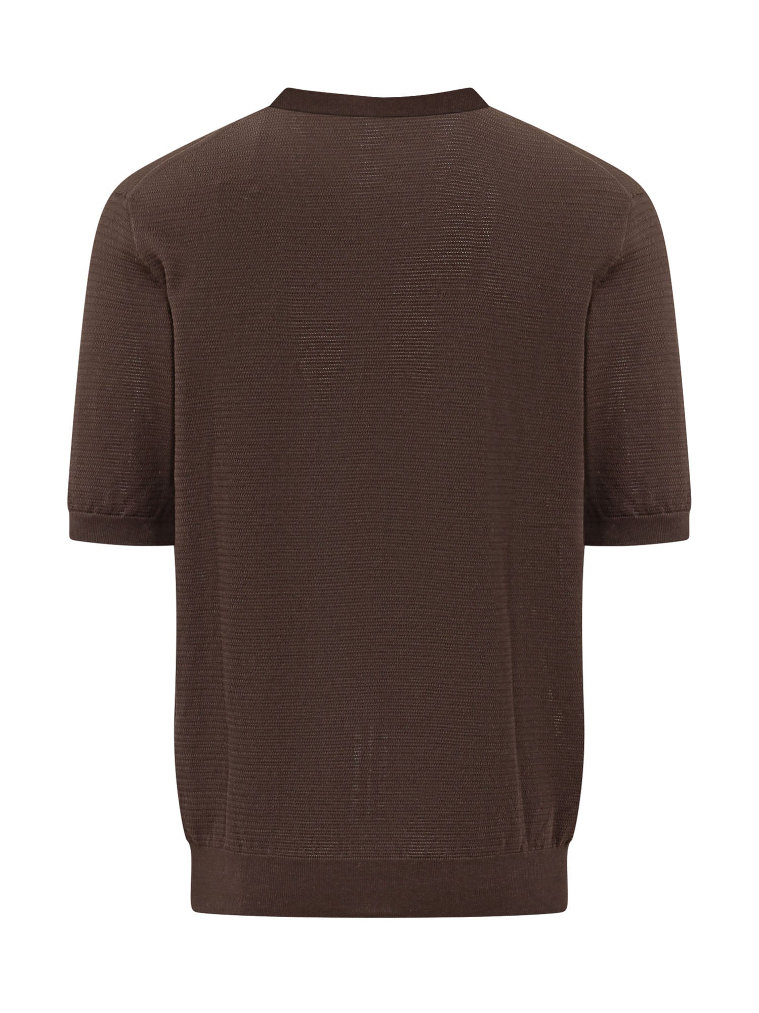 Maglia con scollo girocollo e maniche corte, lavorazione traforata su tutta la superficie con finiture a costine
