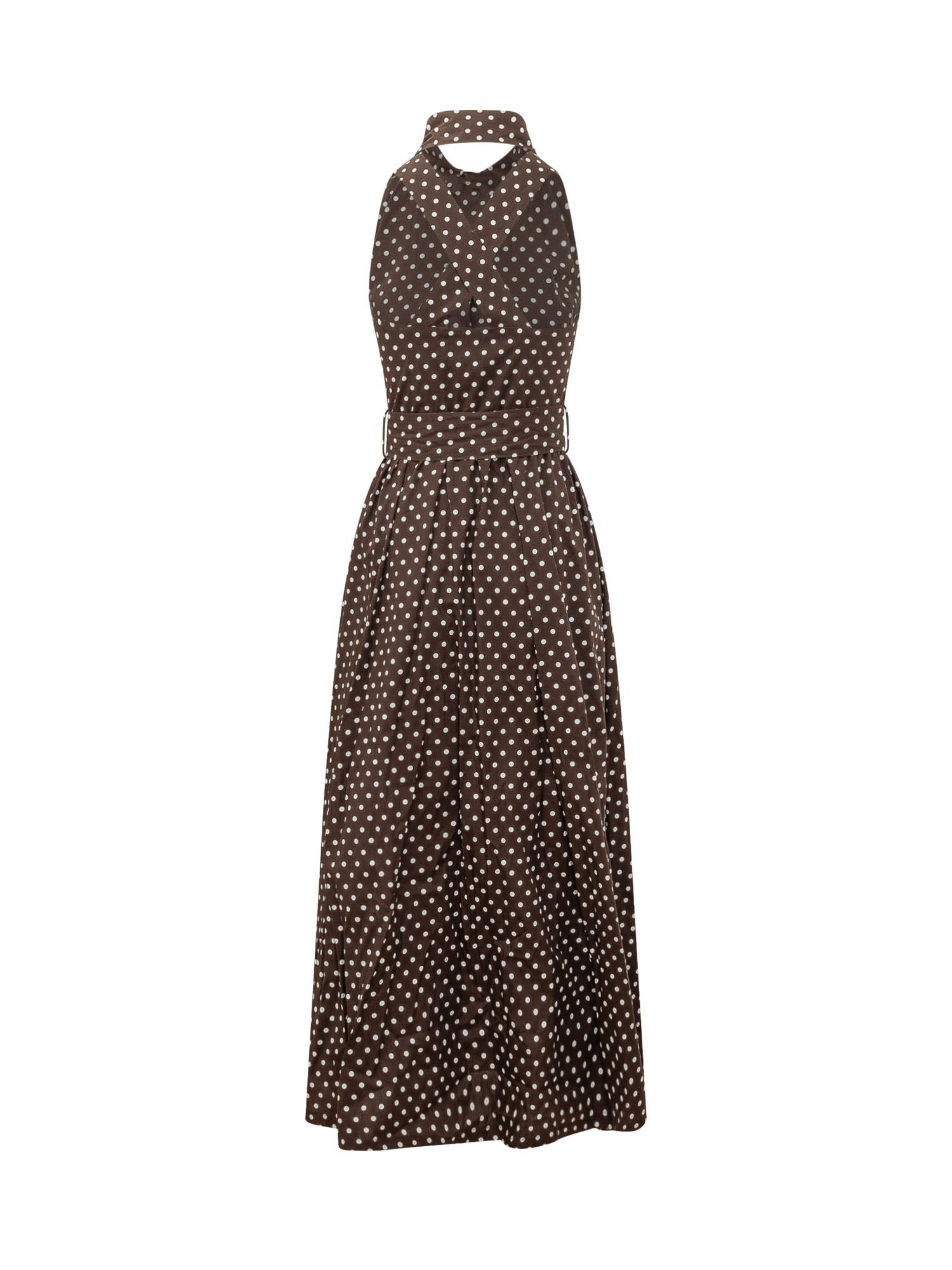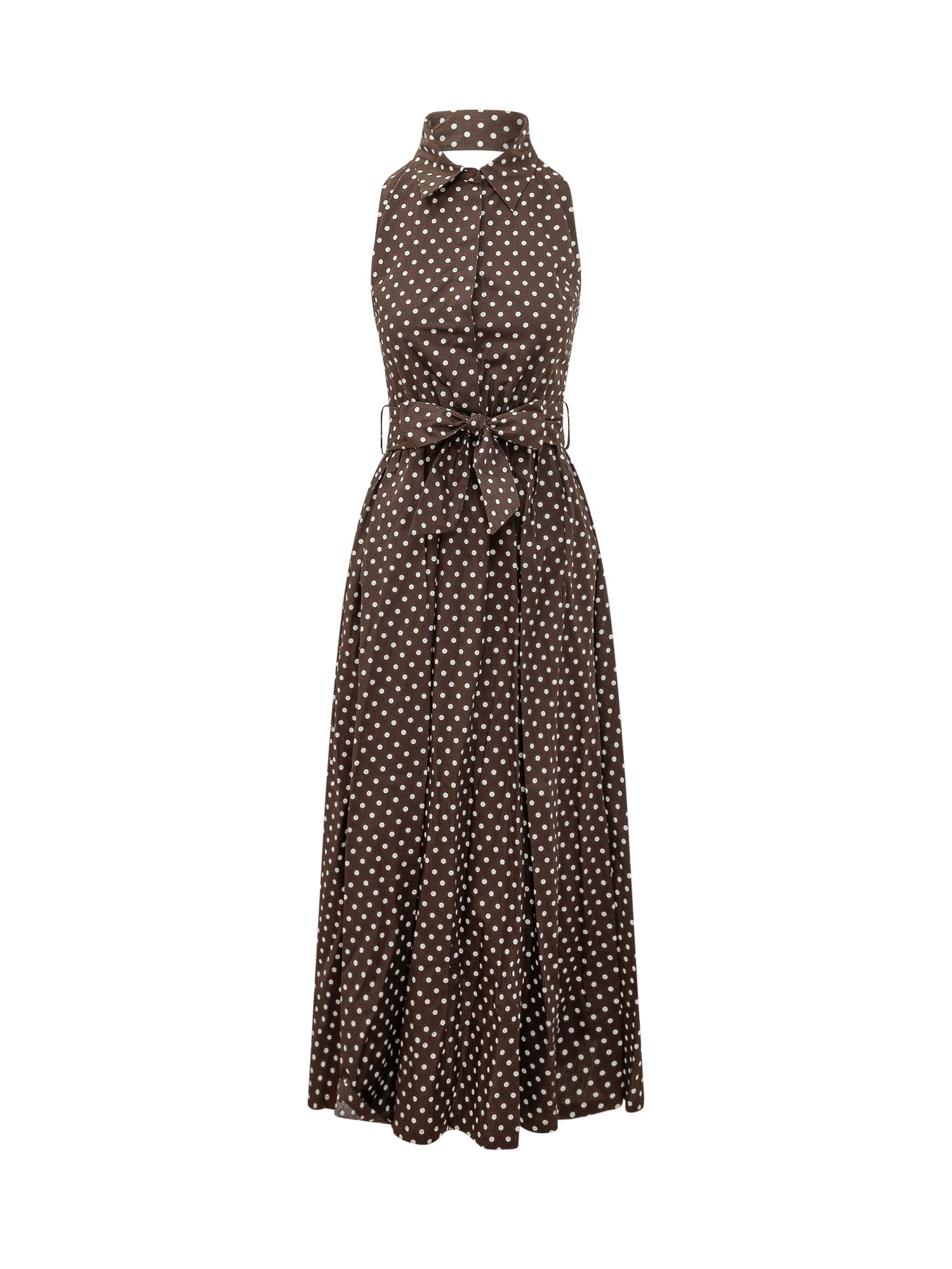 Abito lungo smanicato con colletto e chiusura frontale, caratterizzato da cintura in vita e motivo pois all over