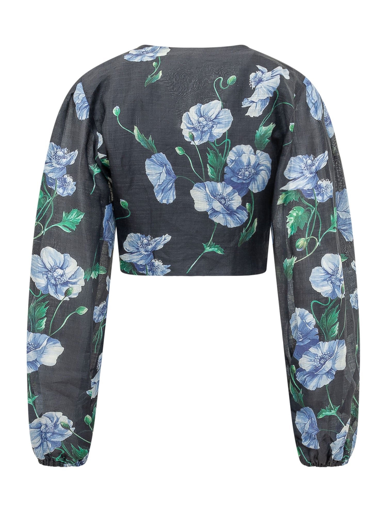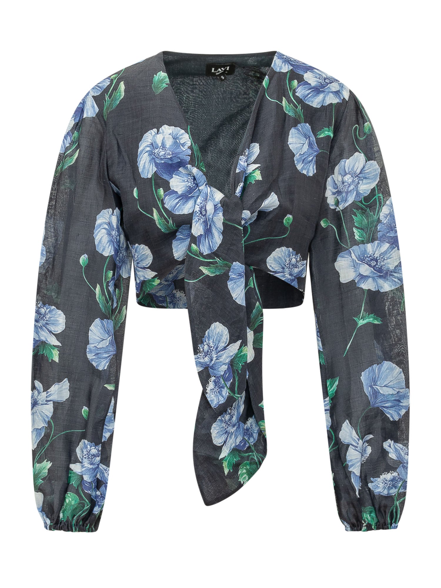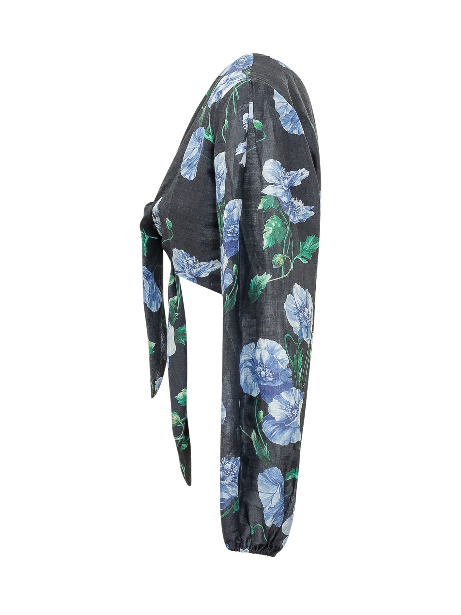 Top corto con maniche lunghe e scollo a V, caratterizzato da chiusura con nodo frontale e stampa floreale all over