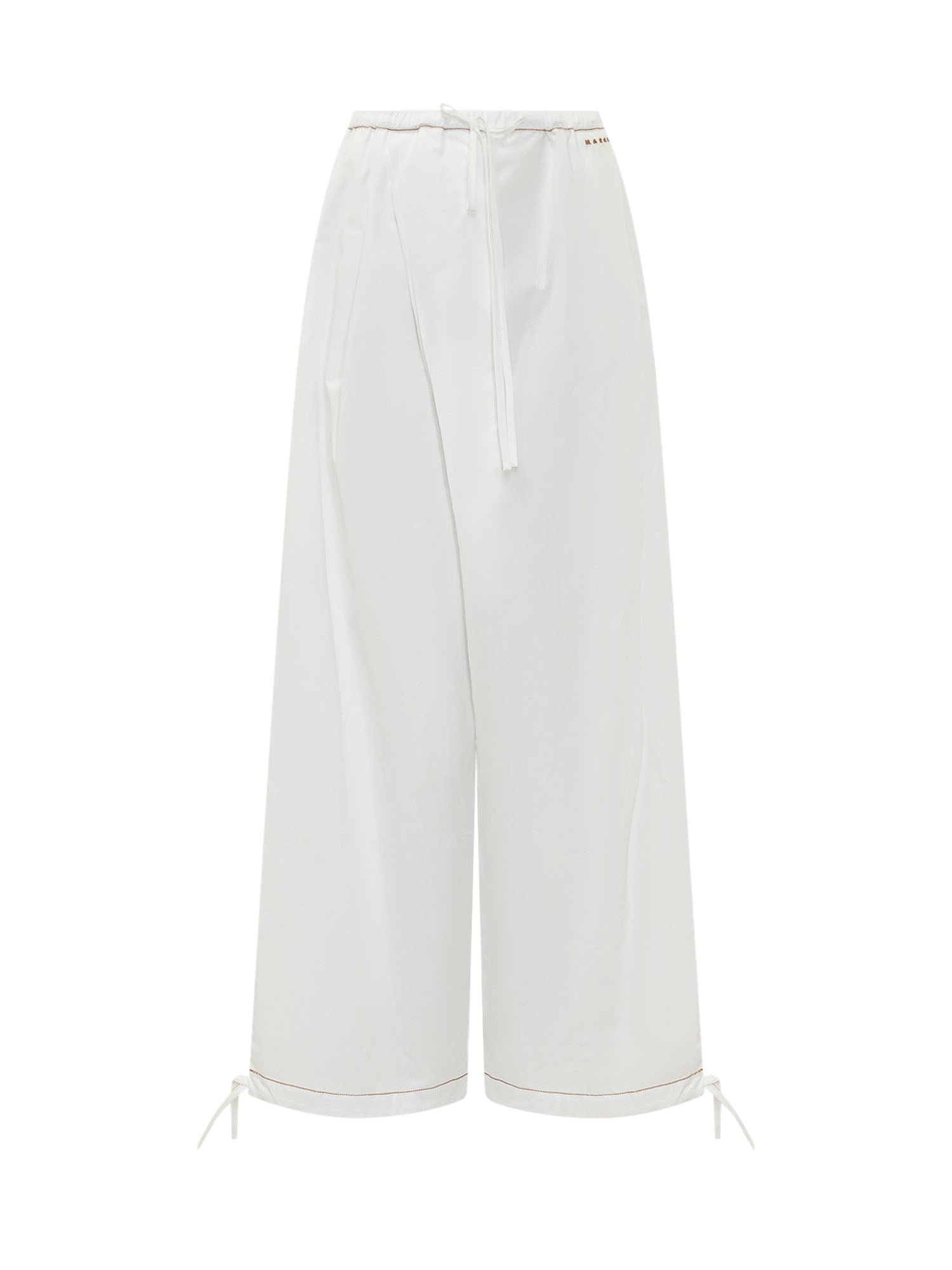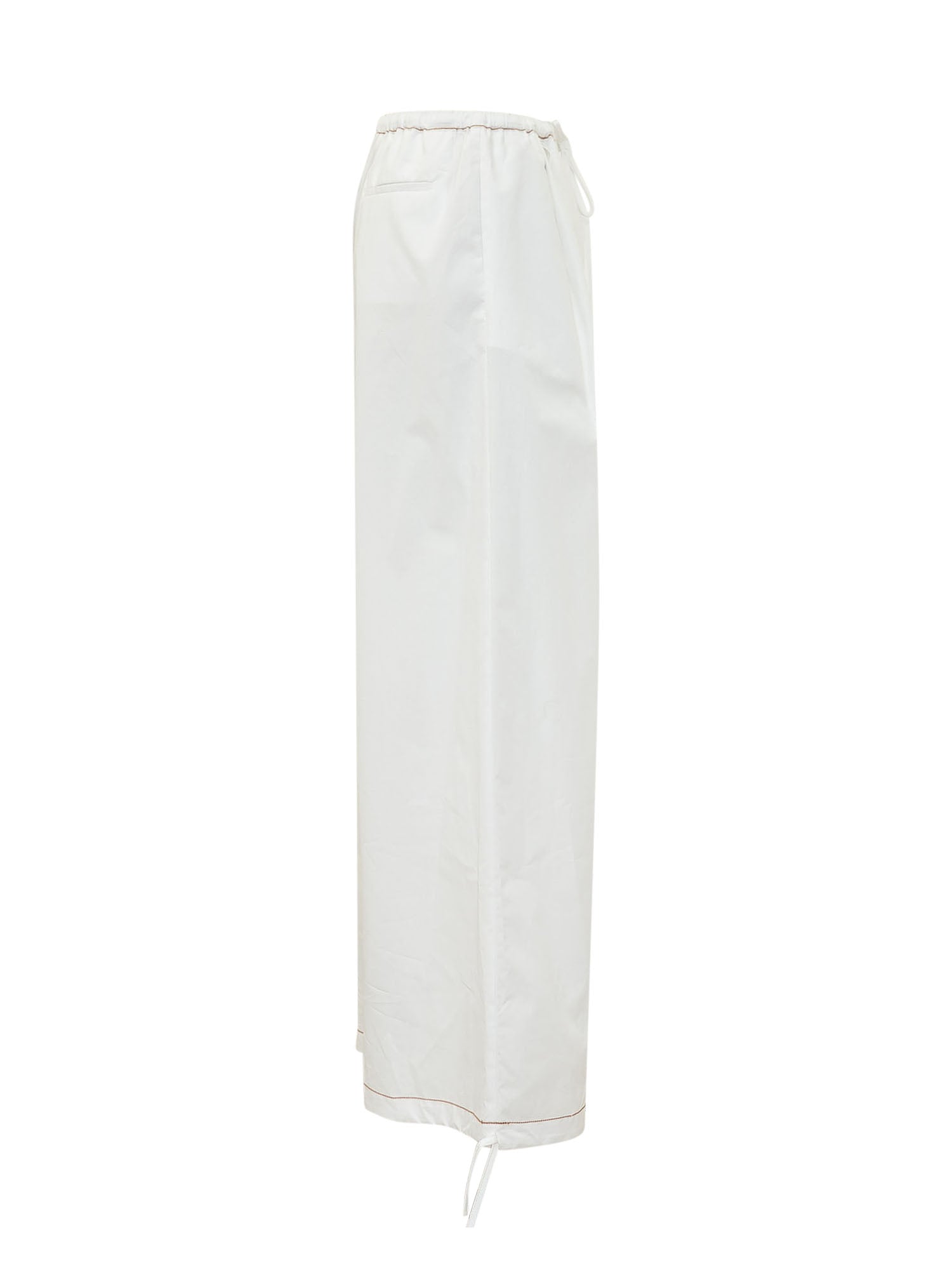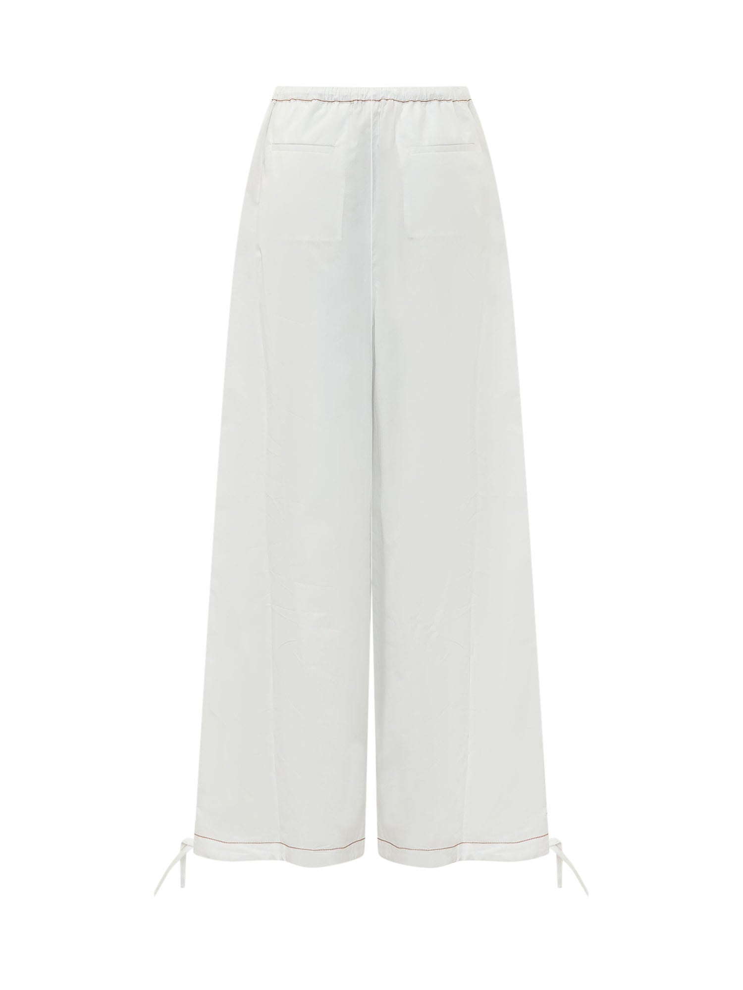 Pantaloni con vita elasticizzata e coulisse, linea ampia e fondo regolabile.