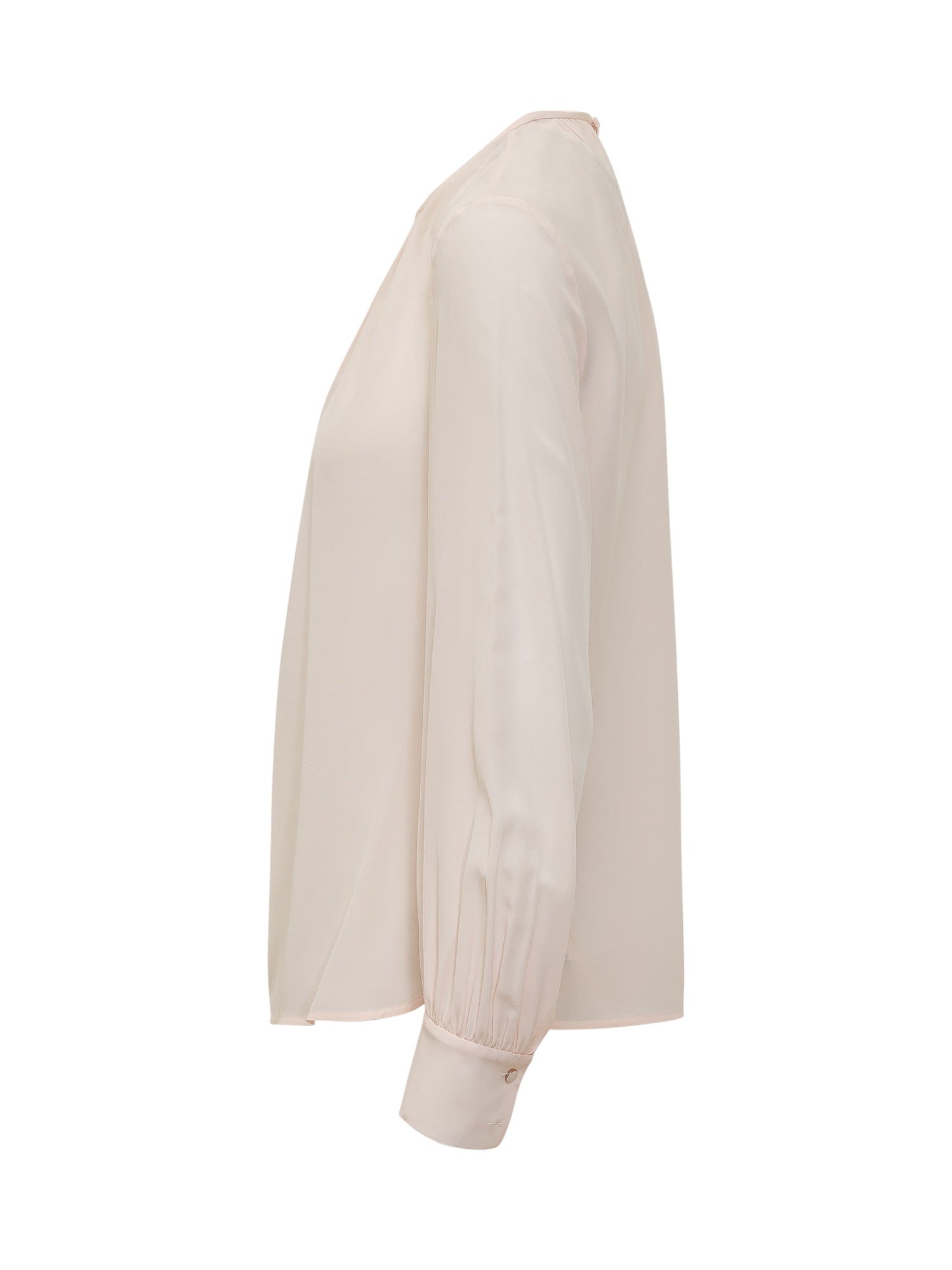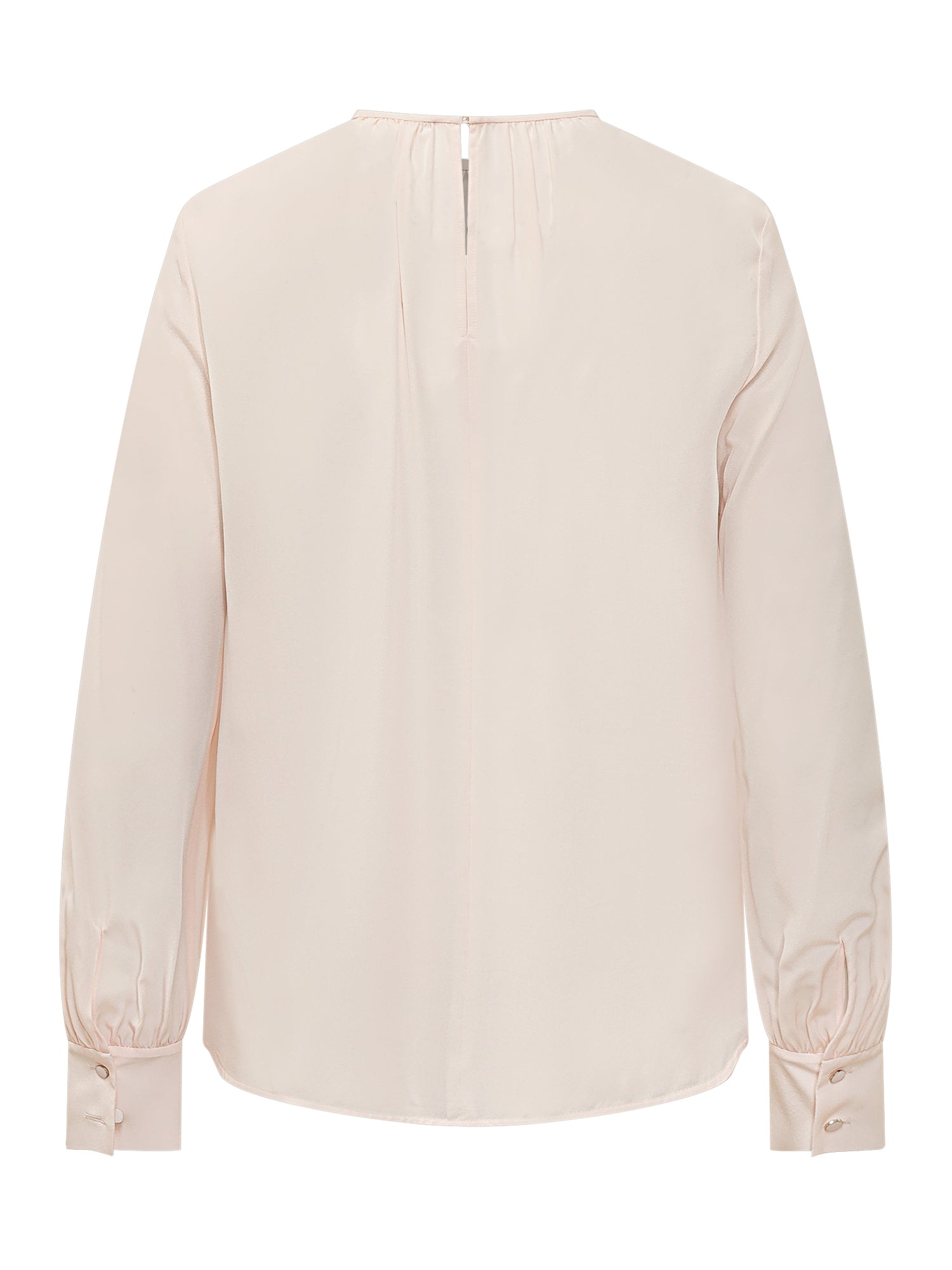 Camicia elegante con scollo arricciato, maniche lunghe con polsini, linea morbida e fluida, chiusura posteriore.