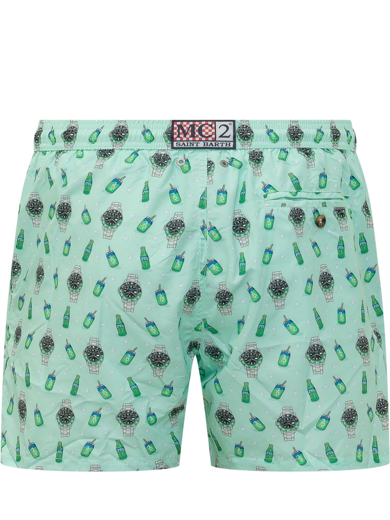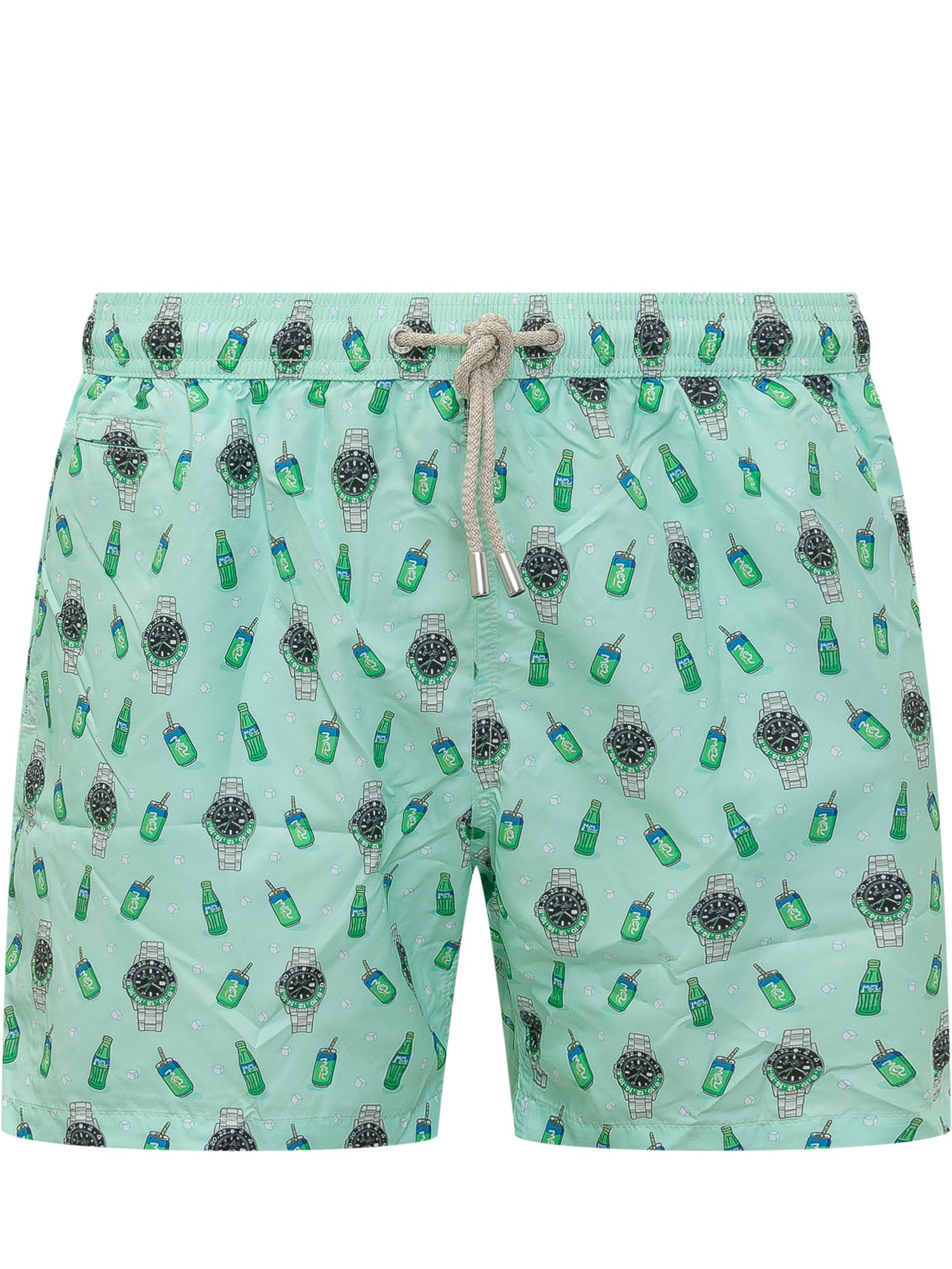 Costume da bagno con vita elastica e coulisse regolabile. Design con motivo illustrato allover composto da orologi e bottiglie. Linea confortevole ideale per attività in acqua e tempo libero.