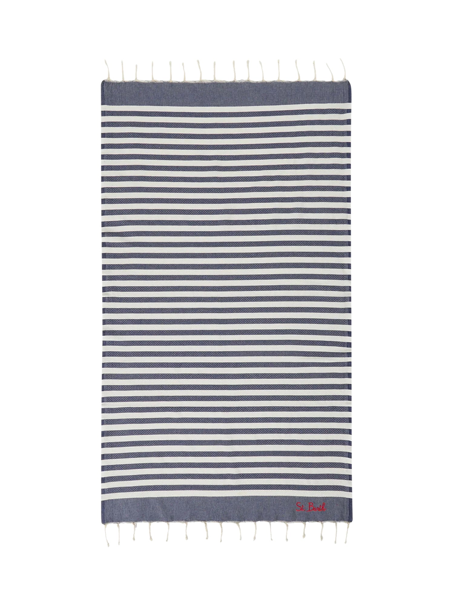 Telo mare con motivo a righe e bordi sfrangiati, design leggero e pratico