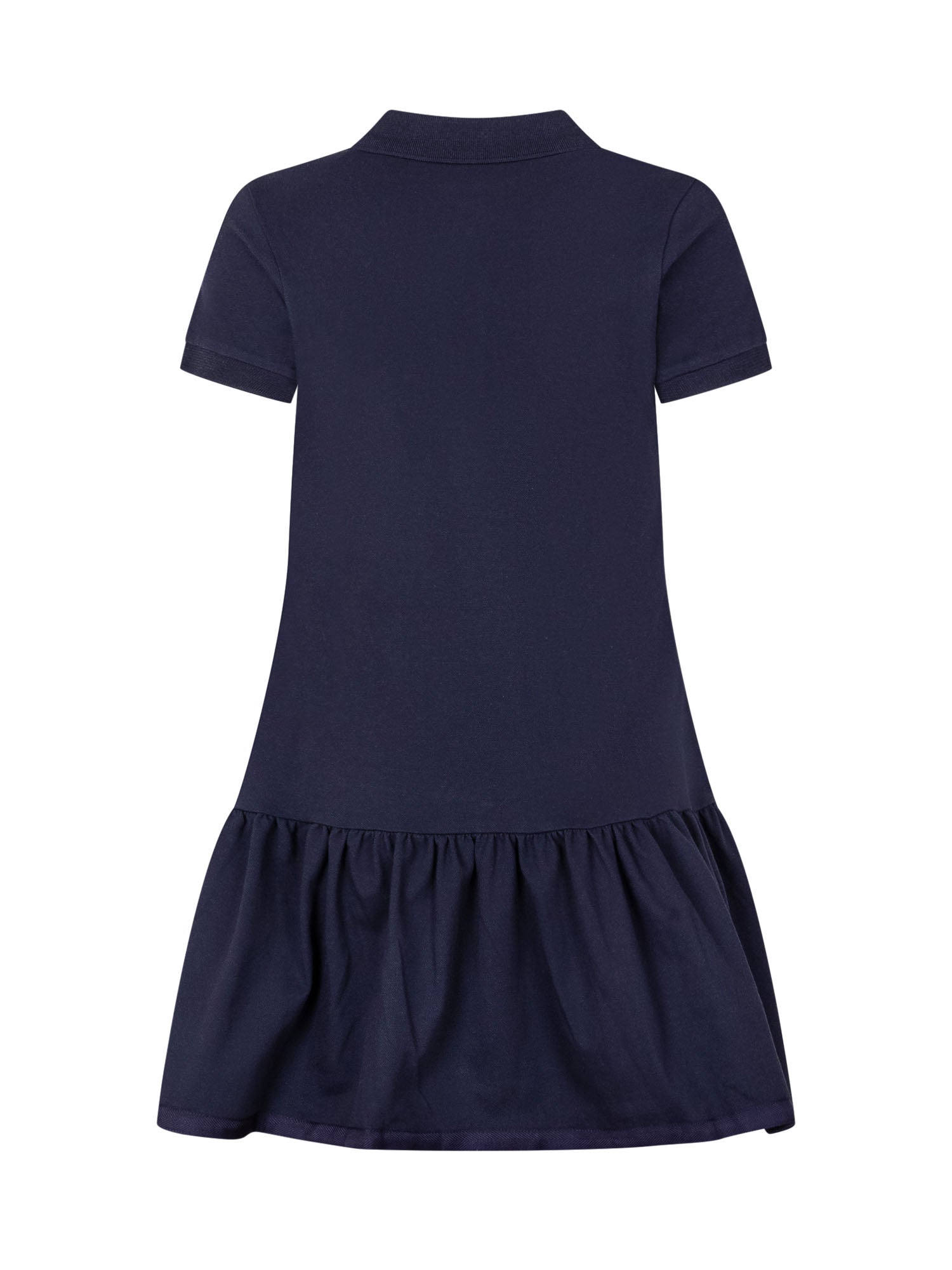 Abito a maniche corte in cotone con colletto polo classico e chiusura con bottoni sul davanti. Il modello presenta linea dritta nella parte superiore con logo applicato sul petto e gonna con balza arricciata sul fondo che dona movimento e volume.