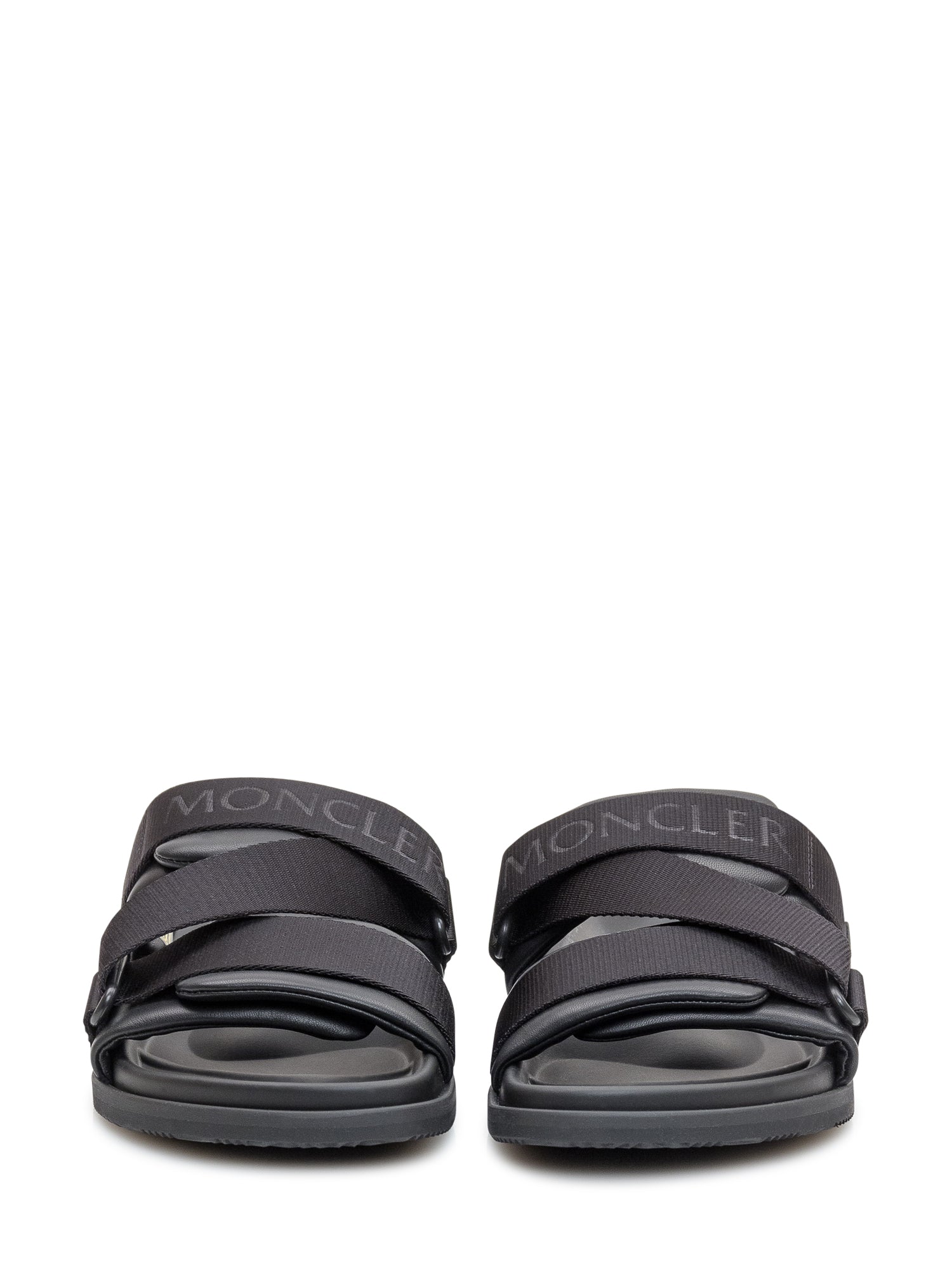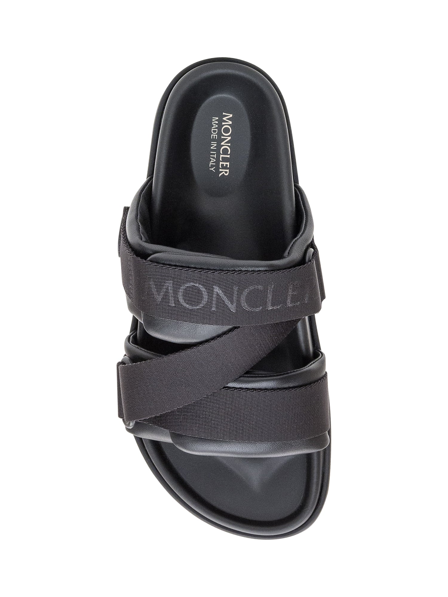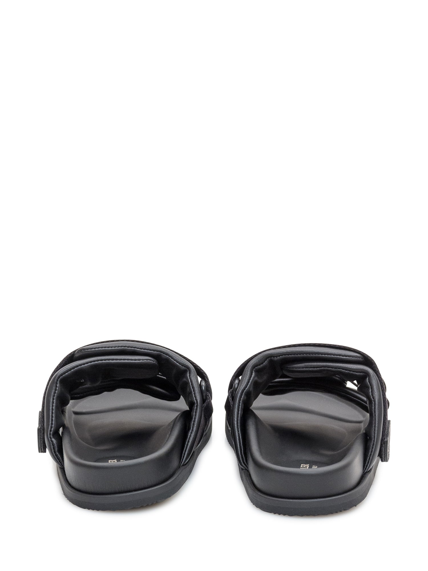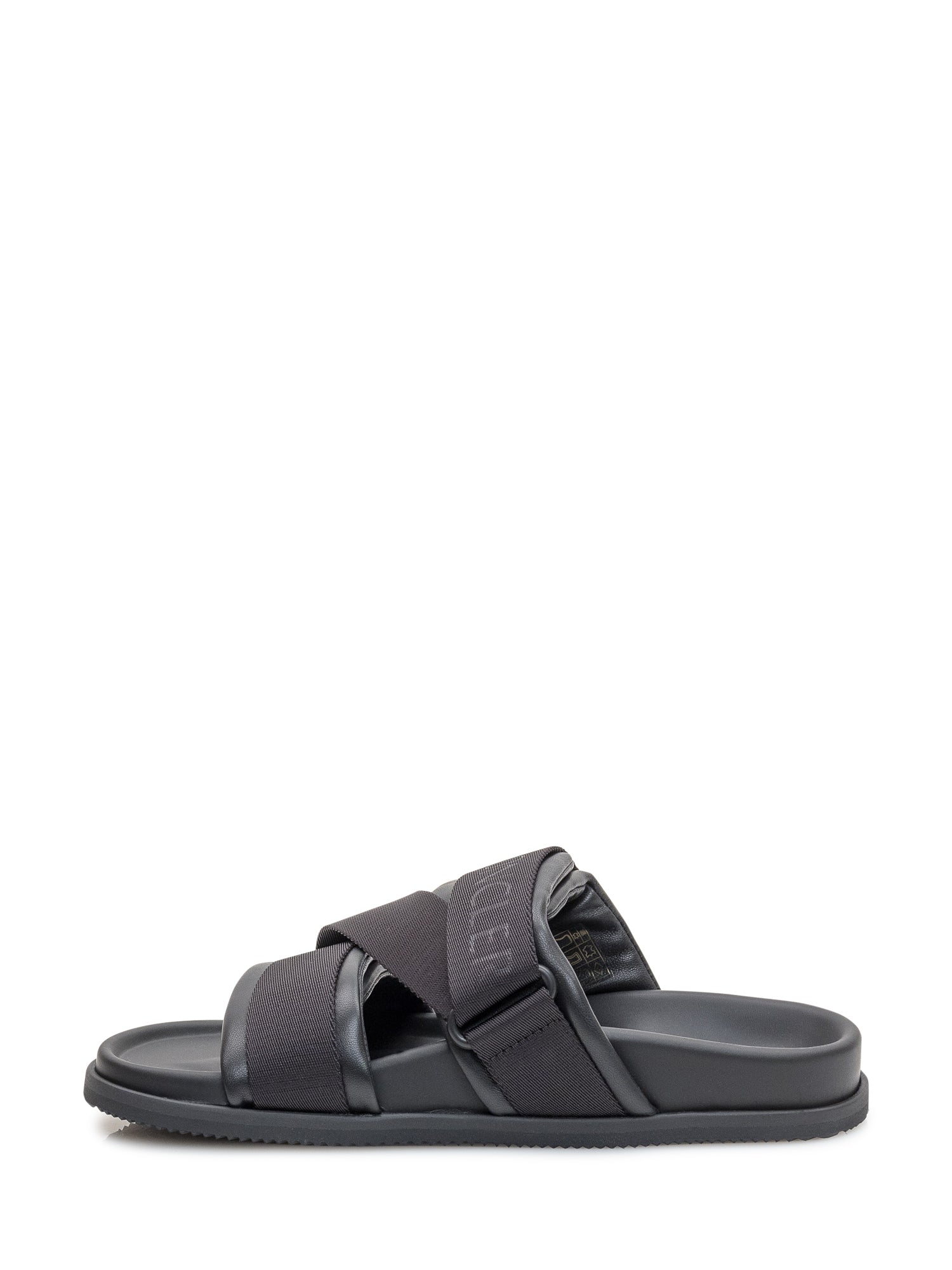 Sandalo nero in pelle. Inserti in tessuto. Logo applicato.