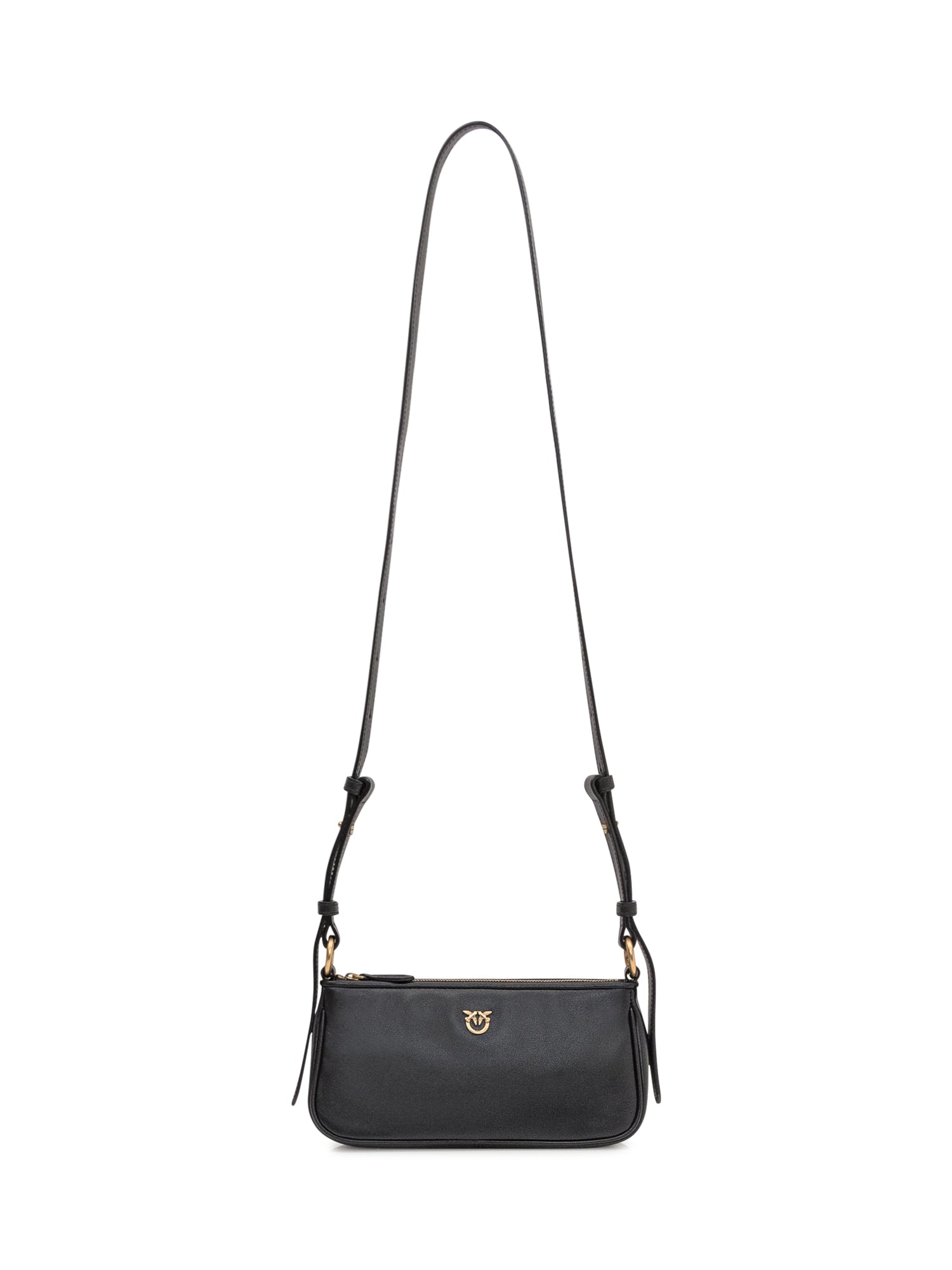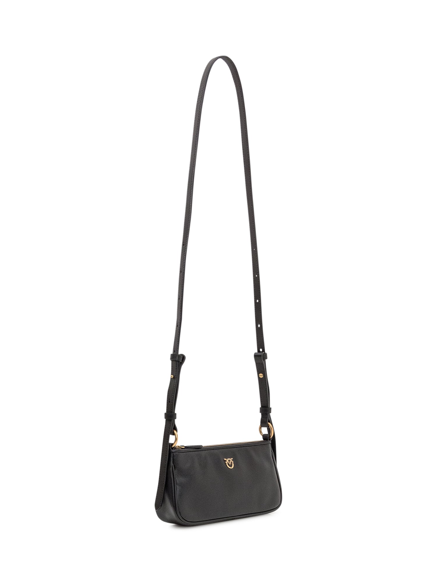 Borsa a spalla Pinko in pelle nera con tracolla regolabile e logo Love Birds dorato.