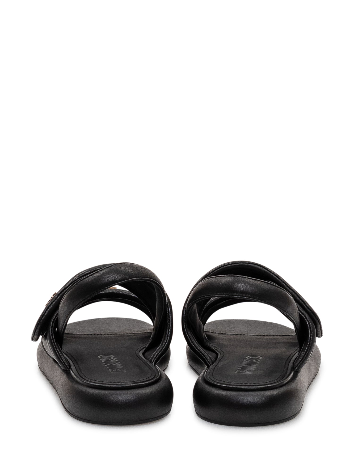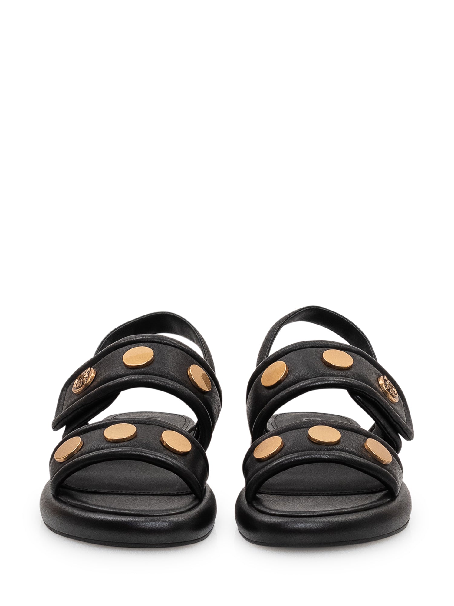 Sandalo flat in pelle con doppia fascia imbottita e cinturino posteriore. Modello arricchito da applicazioni metalliche decorative sulle fasce e suola sagomata per un comfort ottimale, perfetto per un look contemporaneo e deciso.