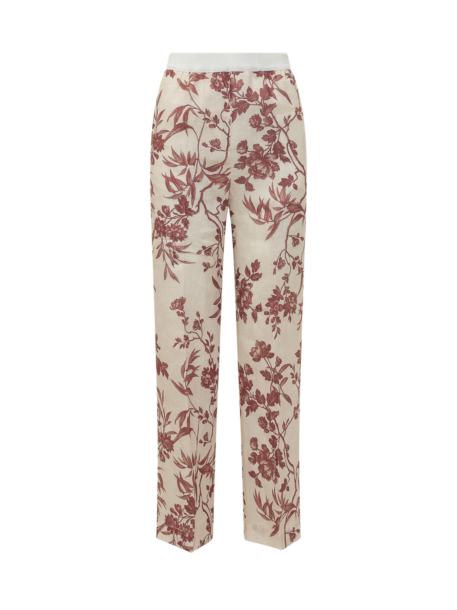Pantalone lungo con vita elasticizzata e gamba dritta, caratterizzato da stampa floreale su tutta la superficie