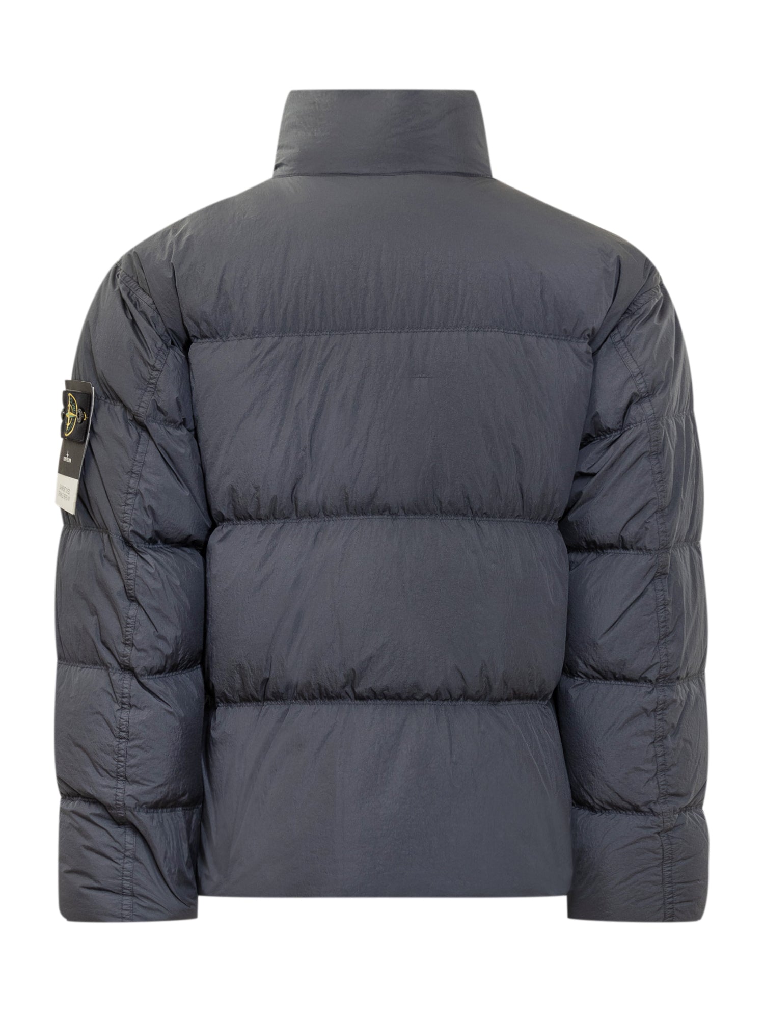 Piumino bomber Stone Island in tessuto tecnico opaco, imbottito in piuma. Presenta un design essenziale con chiusura a bottoni, tasche applicate con bottone e collo alto.