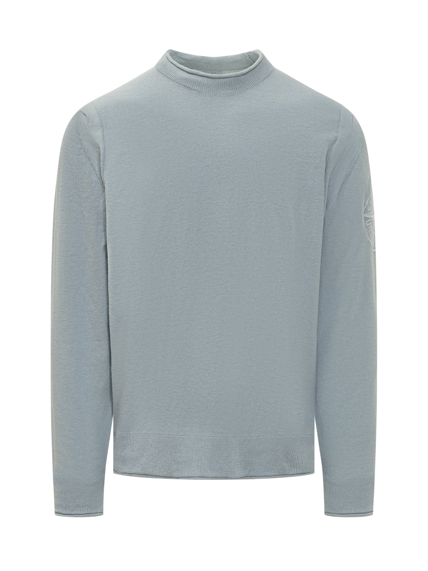 Maglia blu. Maniche lunghe. Collo alto. Collo, orlo e polsi a costine. Logo ricamato sulla manica.