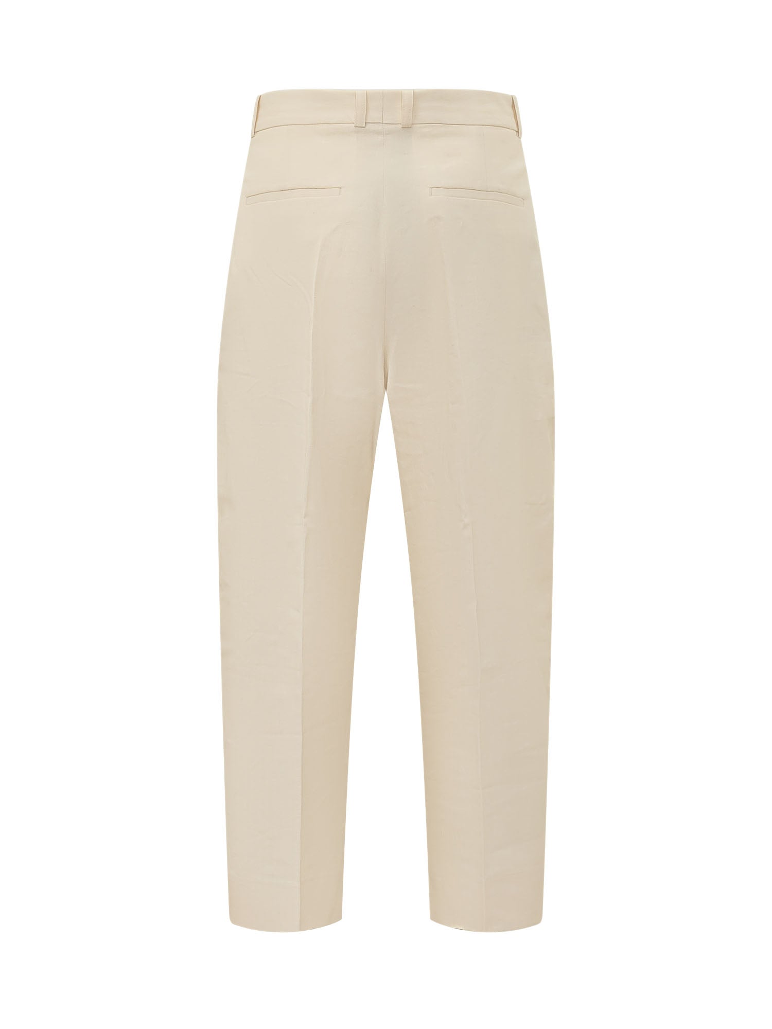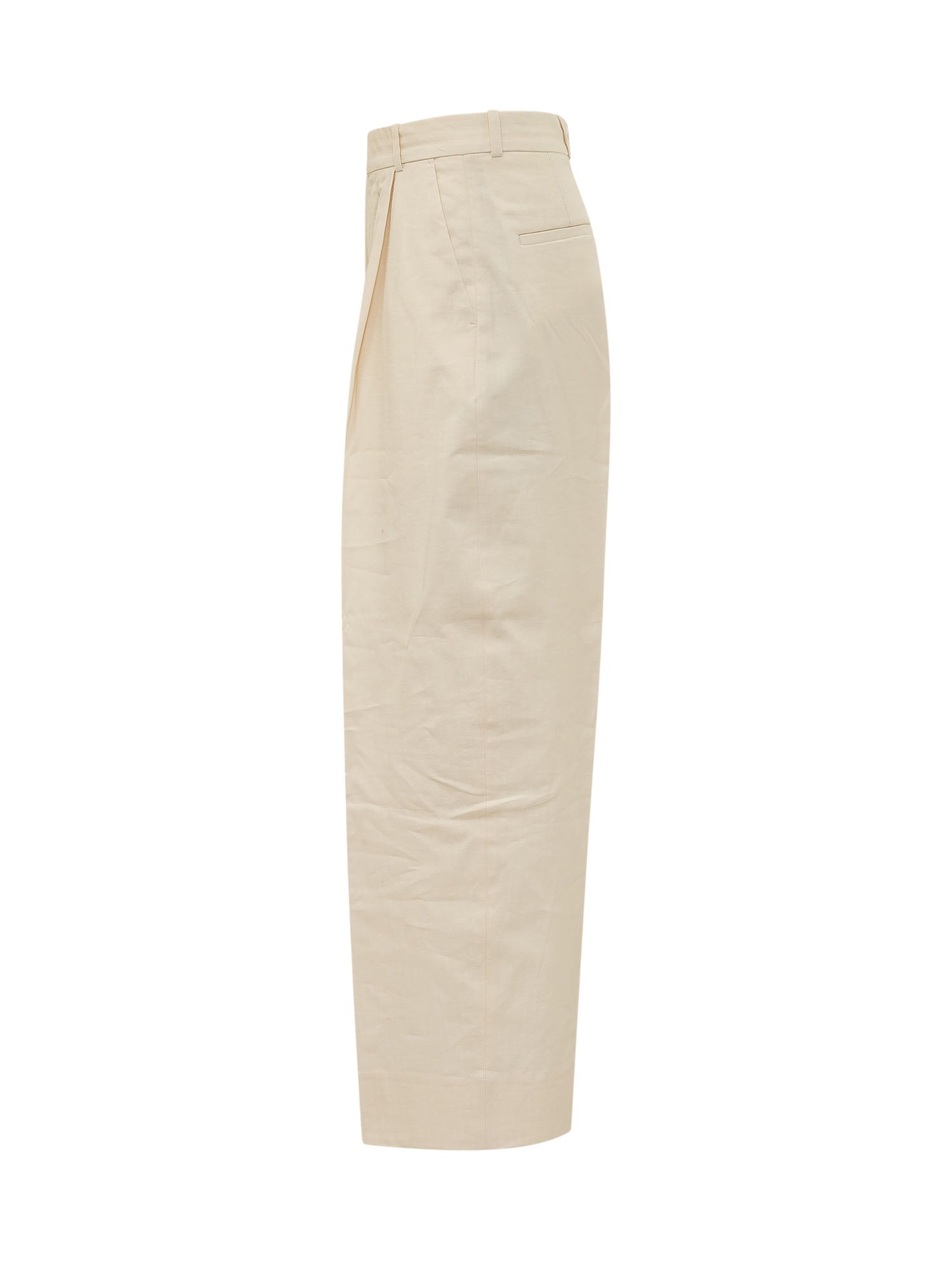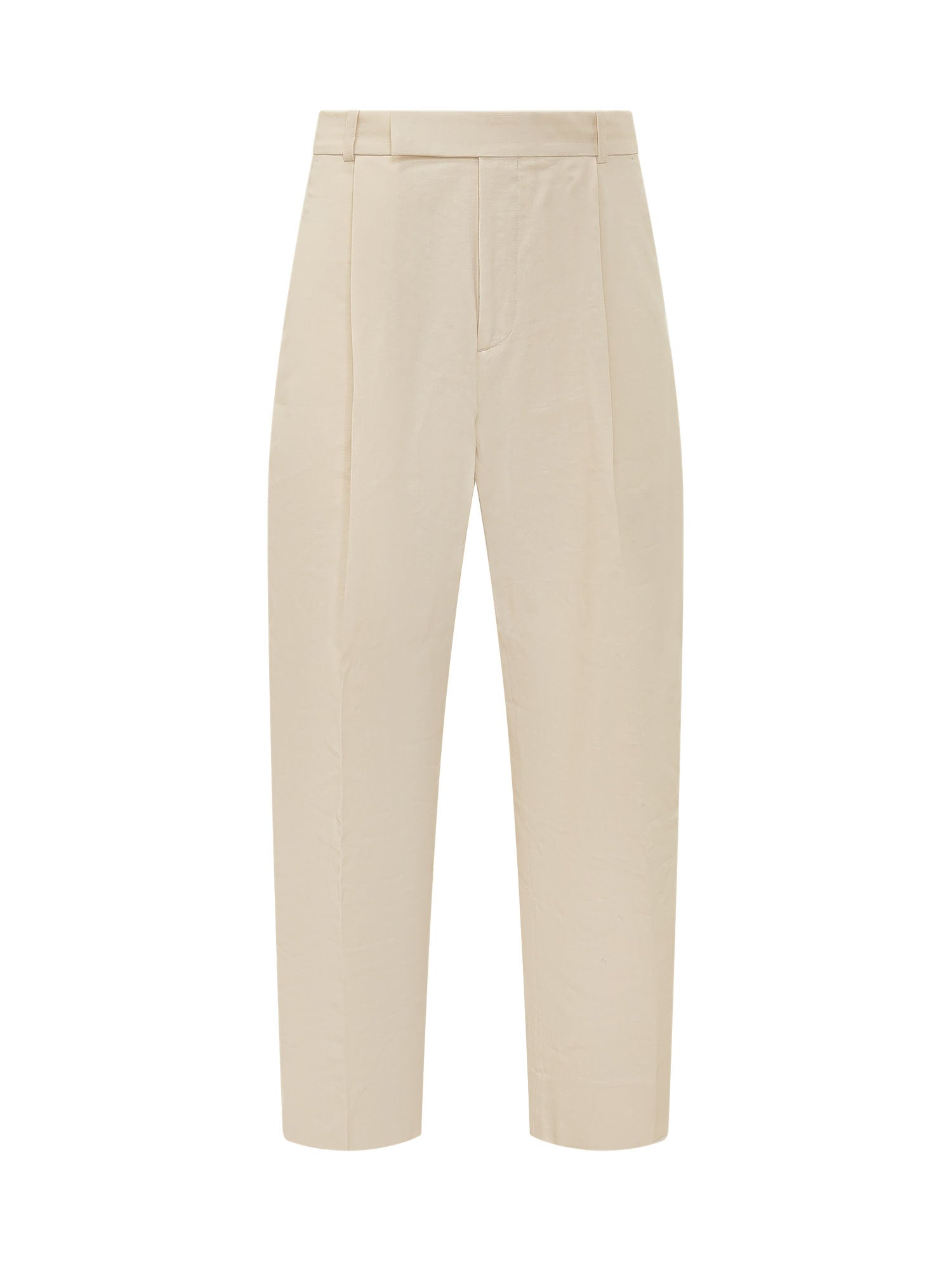 Pantaloni con chiusura frontale e gamba ampia leggermente curva.