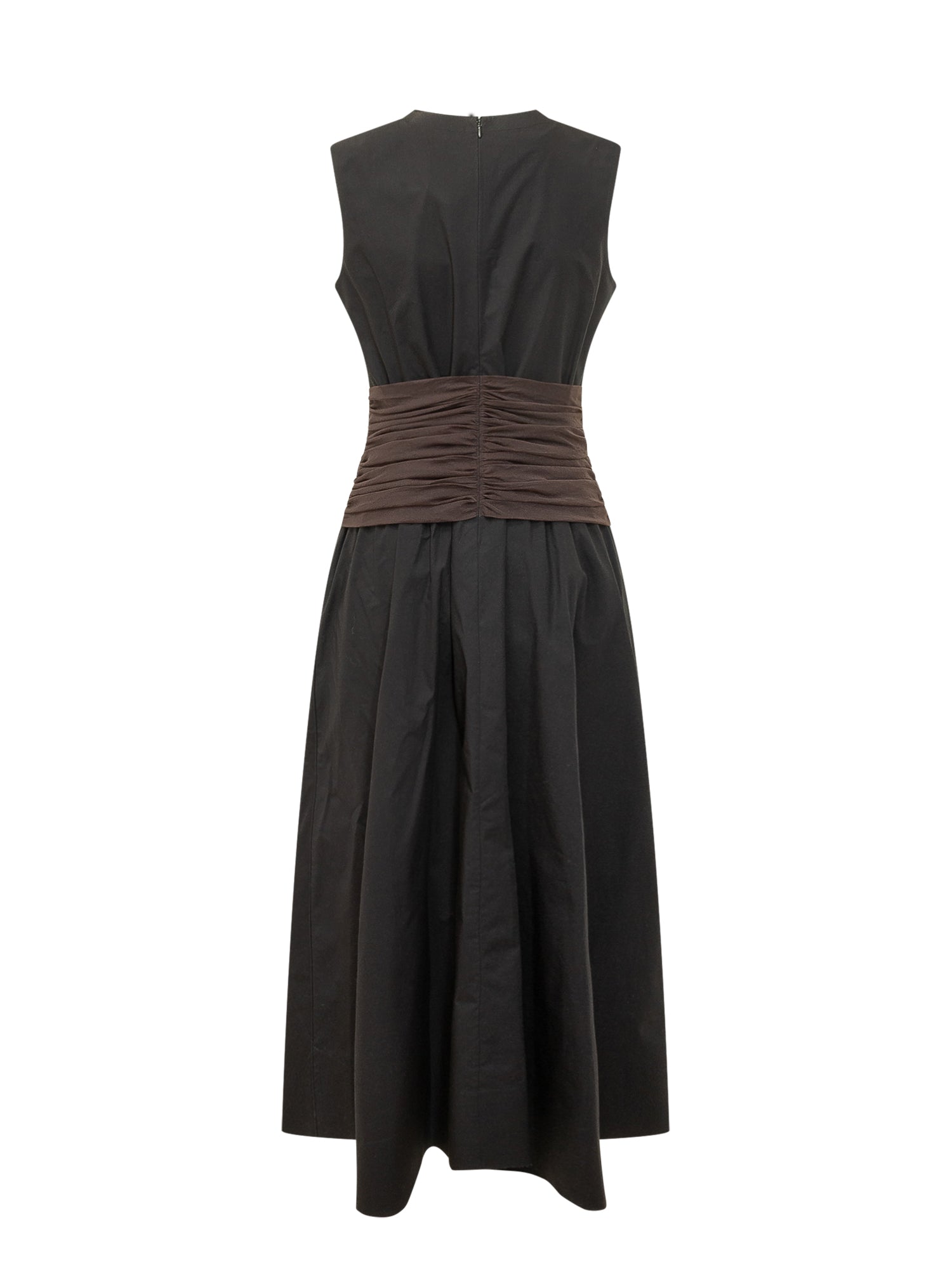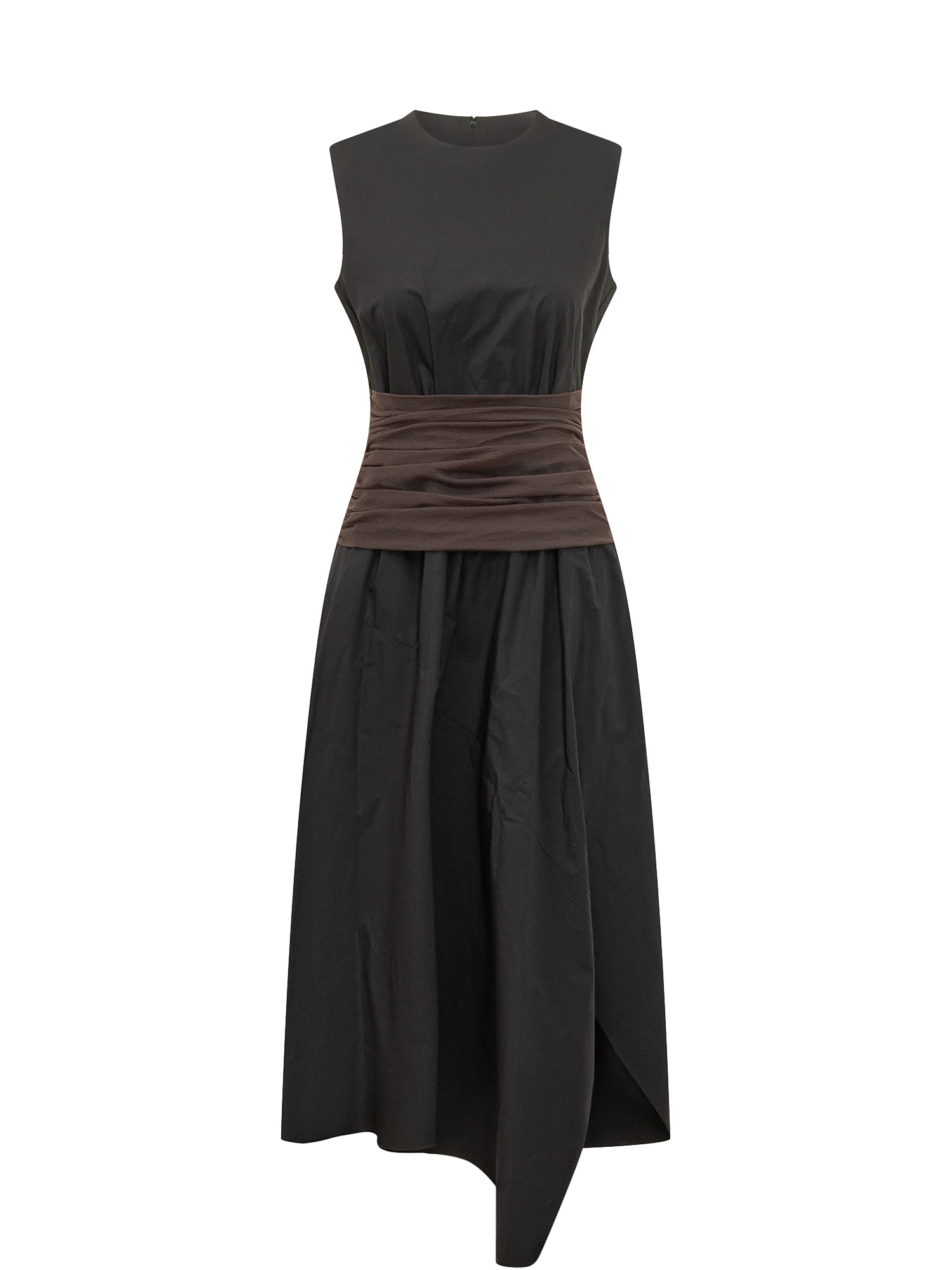 Abito midi da donna senza maniche, scollo tondo, chiusura con zip posteriore, fascia in vita drappeggiata, gonna ampia con fondo asimmetrico.